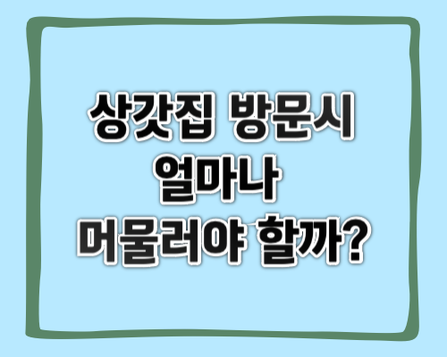 상갓집에 방문하는 경우, 기본적으로 알아야 할 주의사항들이 있습니다. 이러한 주의사항과 더불어서 방문 시에 얼마나 머물러야 하는지도 궁금한데요. 이번글에서는 본인의 역할이나 상황에 따라 얼마나 머물러야 하는지에 알아보겠습니다.   1. 기본적인 조문만 하는 경우체류시간: 30분 이내기본적인 조문만을 하는 경우에는 빈소에 들어가 조문을 하고 유족을 만나 위로의 말을 하고 바로 나오는 경우가 있겠습니다. 이 때는 주로, 바쁜 일정이 있거나 고인과의 관계가 그리 가까운 편이 아닌 경우가 될 것입니다.   장례식장 조문 방법 자세히 알아보기  2. 조문 후 식사까지 할 경우체류시간: 1시간 ~ 1시간 30분일반적으로는 조문 후에 식사까지 하는 경우가 대다수의 조문객들이라고 할 수 있습니다. 유족이 마련한 국밥과..