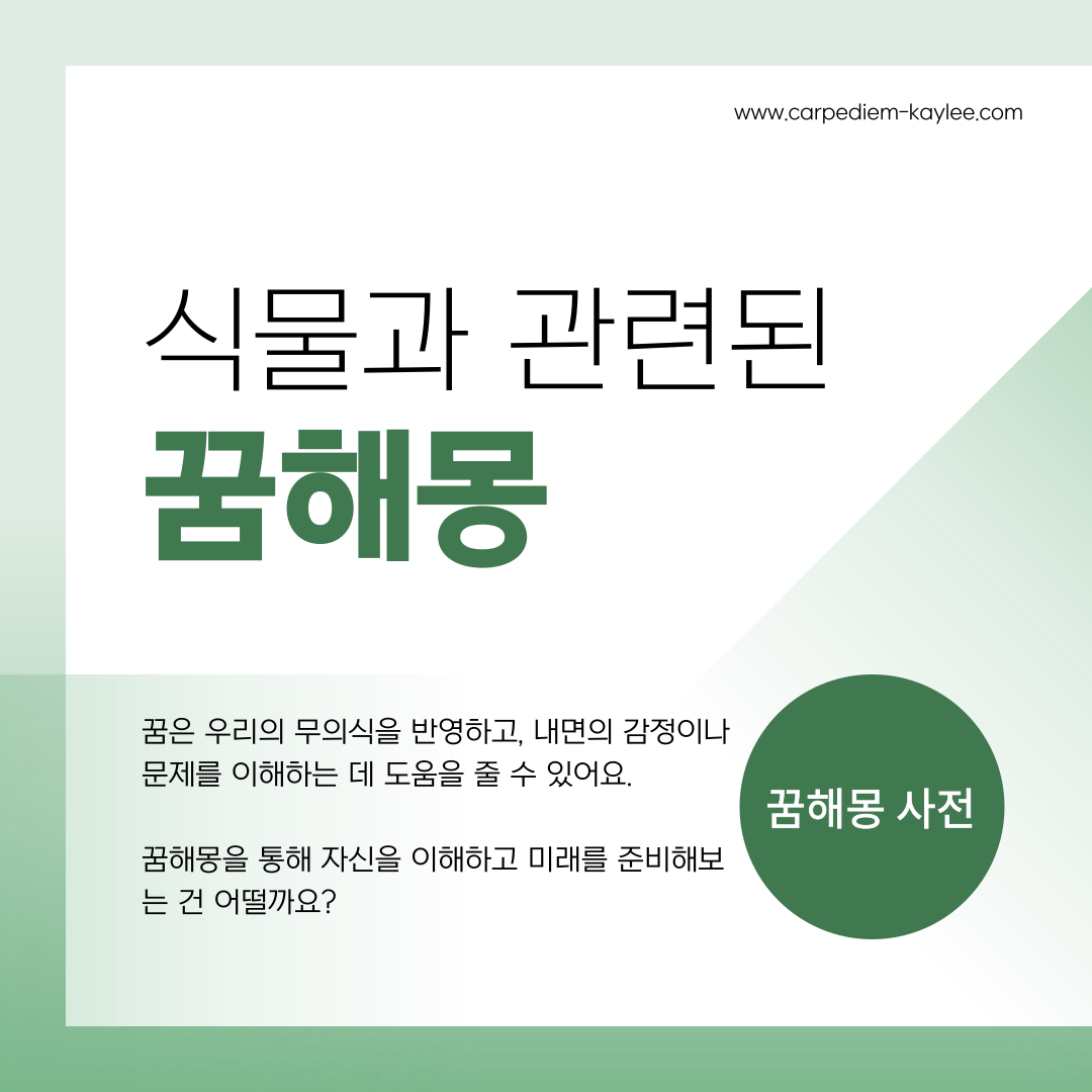 식물이 등장하는 꿈은 생명력, 성장, 변형, 그리고 새로운 시작을 상징하는 경우가 많습니다. 식물은 자연의 중요한 부분으로, 꿈에서 식물이 나타나는 것은 우리의 삶에서 중요한 변화, 발전, 또는 감정적 상태를 반영할 수 있습니다. 식물 꿈의 해석은 꿈에 등장하는 식물의 종류, 상태, 그리고 꿈에서의 상황에 따라 달라질 수 있습니다. 1. 식물의 상태에 따른 해석건강하고 푸른 식물: 건강하고 푸르게 자라는 식물이 꿈에 등장한다면, 이는 당신의 삶에서 긍정적인 변화나 성장이 일어나고 있음을 나타냅니다. 이는 당신의 목표나 계획이 잘 진행되고 있거나, 당신의 정신적 또는 감정적 상태가 매우 안정적이고 풍요로움을 의미할 수 있습니다.시들거나 죽어가는 식물: 반대로, 시들거나 죽어가는 식물이 등장하는 꿈은 현재의..