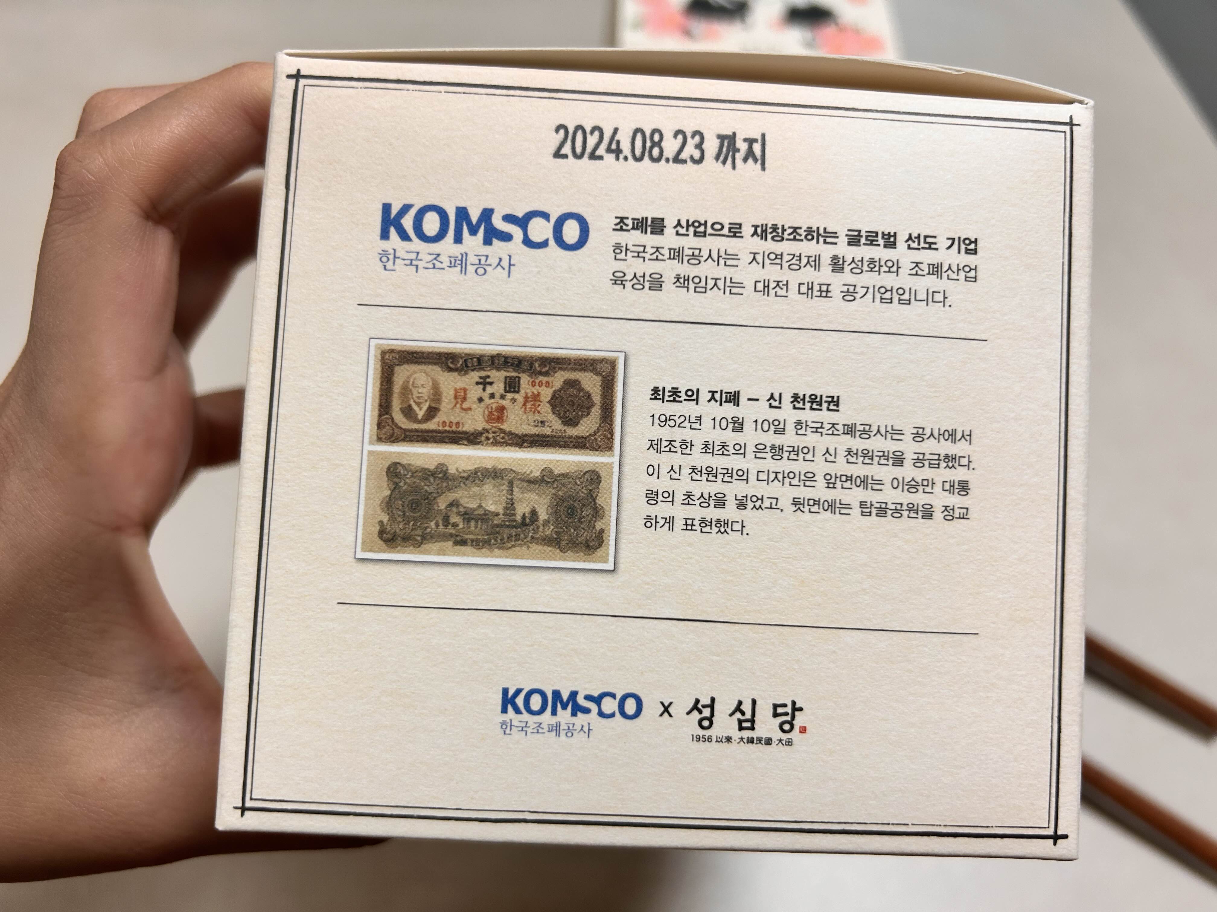 상자 겉면 양 사이드에는 조폐공사와 성심당의 이야기를 설명해 주고 있어요. 두기업 모두 대전을 대표하는 기업인데요. 조폐공사는 지역경제 활성화와 조폐산업육성을 책임지는 대전 대표 공기업이구요. 성심당은 대전의 문화가 되어 모두가 행복한 경제를 이루어가는 대전의 향토 빵집입니다.