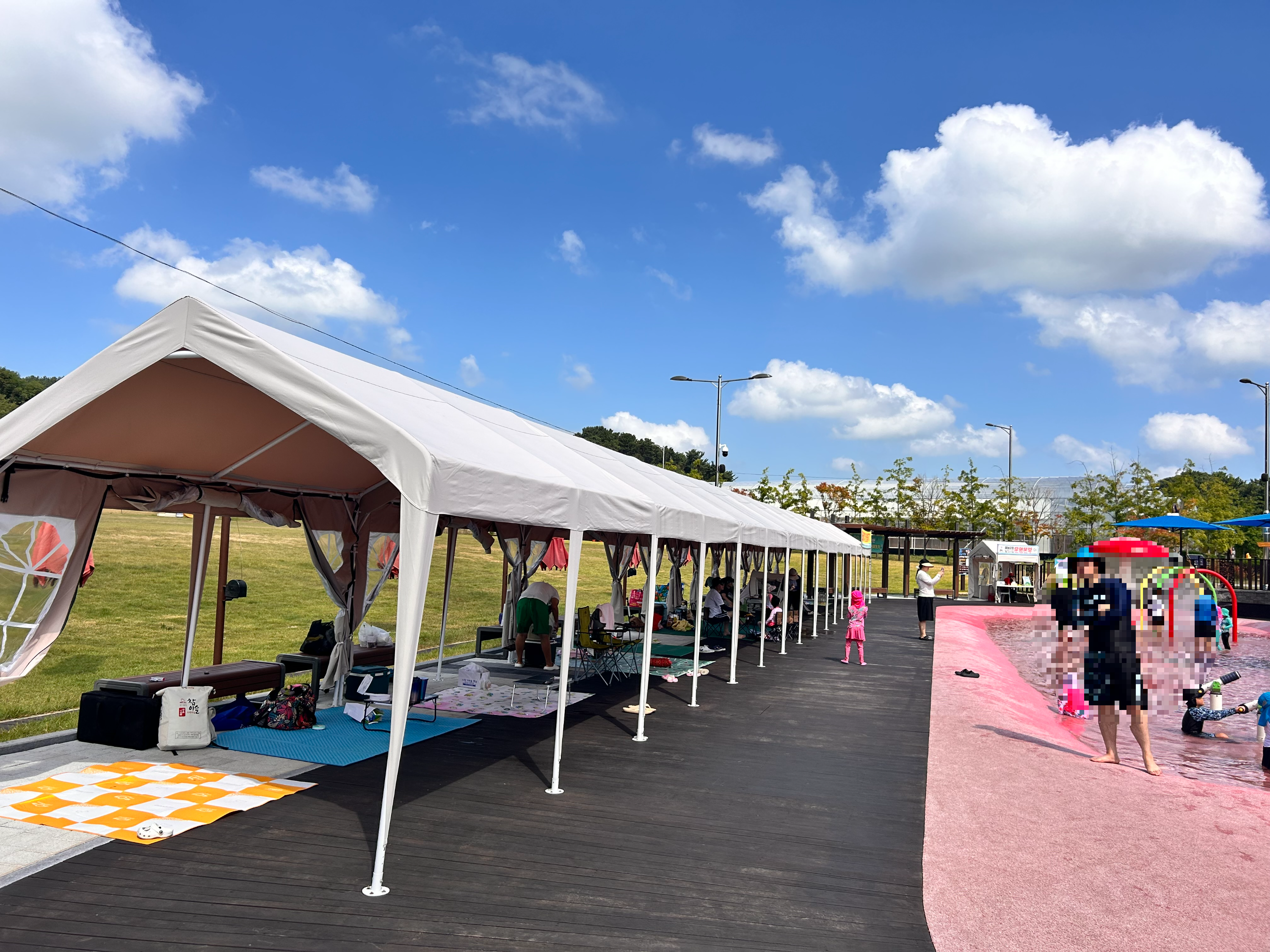 물놀이장 주변으로는 파라솔이 설치되어 있어서 돗자리로 자리를 맡고 편하게 즐기기만 하면 됩니다.