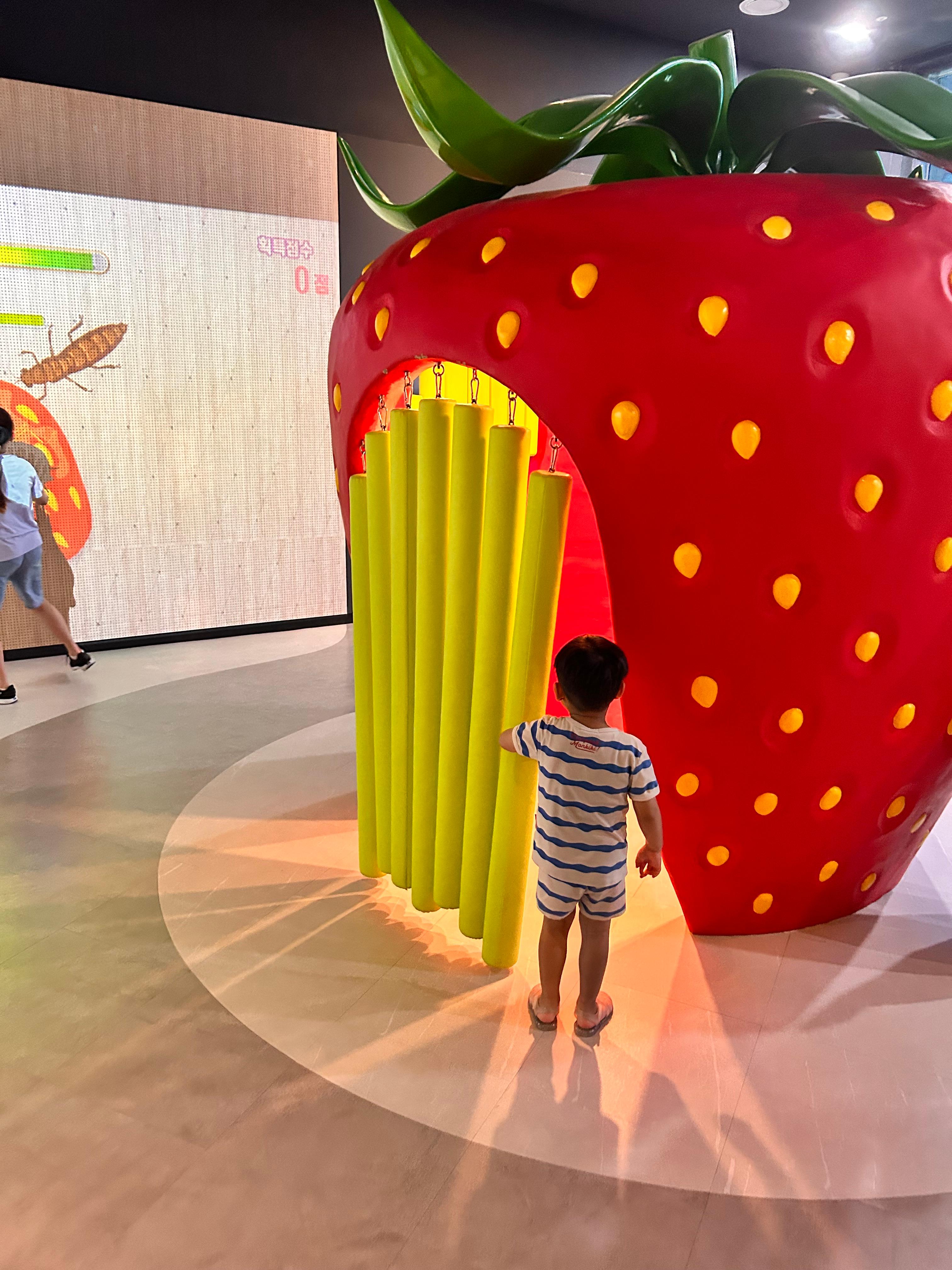 3시간 정도 물놀이를 하다보면 아이도 조금 지겨워하기 마련인데, 샤워하고 이번에는 실내 키즈존으로 이동해 봅니다. 물놀이를 즐기고 샤워실에서 깨끗하게 샤워후 실내 키즈존까지 즐길 수가 있어요. 물놀이장을 정리하고 나와서는 오른편으로 보면 딸기 테마관이 있어요. 딸기 테마관에서 딸기와 함께 시간을 살짝 보낸 후, 힐링생태체험관으로 이동하면 실내키즈존과 작은 도서관이 나옵니다.
