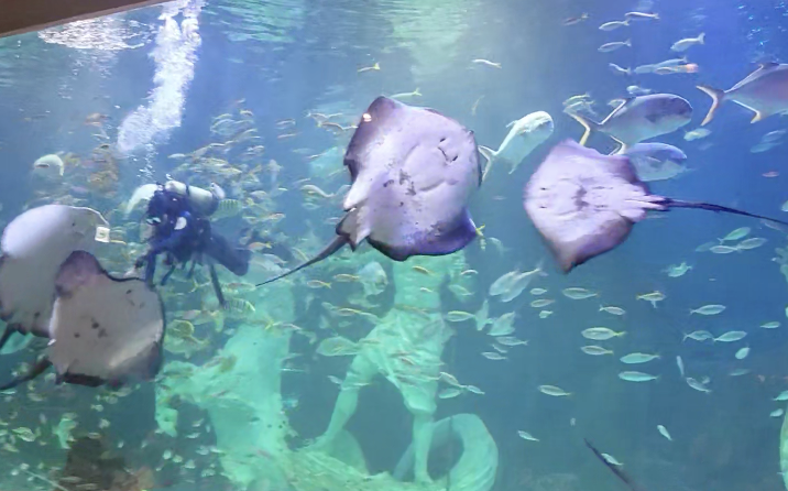 아쿠아리움의 매력을 제대로 느끼고 싶다면, 피딩쇼를 강력 추천드립니다. 피딩쇼에서는 다이버가 직접 대형 수조 안으로 들어가 물고기들에게 먹이를 주고 물밖의 관객과 소통하는데요. 열대어와 가오리 등의 먹이 반응을 눈앞에서 볼 수 있으니 무척 생동감 너무치고 아이도 넘 신기해하더라고요. 특히, 거대한 가오리가 입을 벌려 먹이를 받아먹는 순간이 흥미진진하고 거대한 가오리 자체를 관람하는 게 너무 즐거웠습니다.