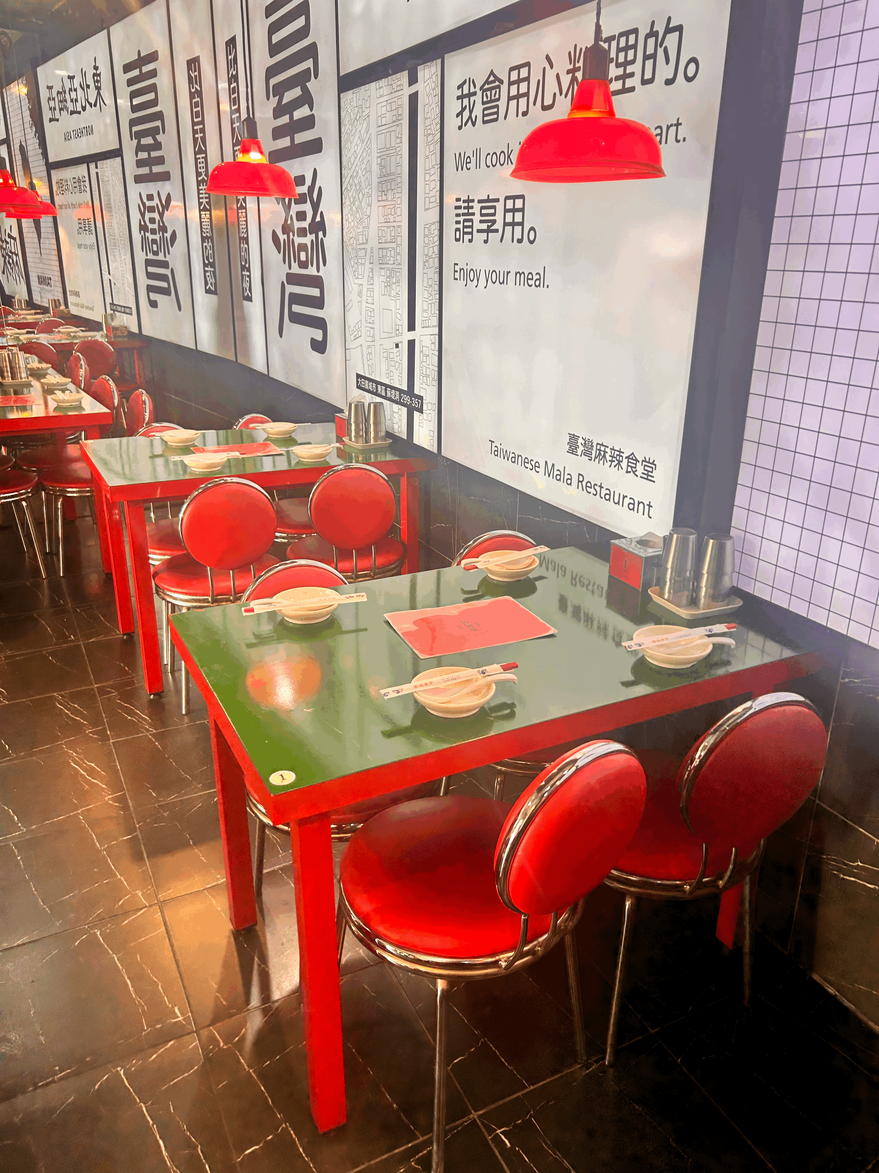 동북아 식당 내부 모습은 빨간색과 초록색의 조화가 눈에 띈다. 의자는 빨간색이고, 식탁은 초록색으로 되어 있어서 아주 강렬하다. 내부가 꽤 아기자기하고 깔끔해서 데이트 장소로도 손색이 없는 곳인 듯하다. 조명도 빨간색으로 아주 귀엽다.