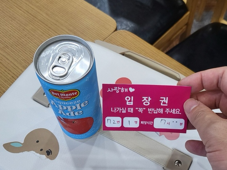 선불결제를 하고 입장하였어요. 귀여운 핑크색 입장권인데, 위에는 사랑해라고 쓰여있네요. 퇴장시간이 함께 기입되어 있어요. 보호자는 2,000원에 음료를 선택할 수 이어요. 저는 시원한 사과주스로 한잔 골라보았습니다.