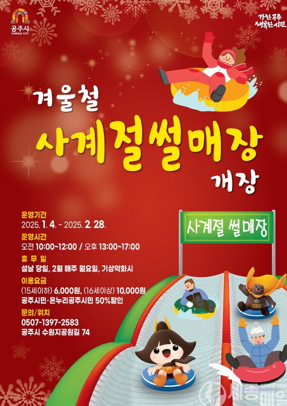 저렴한 이용료로 알차게 즐길 수 있는 이번 기회를 놓치지 마세요! 하얀 눈 위를 미끄러지며 느낄 짜릿한 즐거움과 웃음소리는 추운 날씨마저 잊게 해줄 거예요. 이번 겨울, 공주 사계절썰매장에서 행복을 쌓아보세요!
