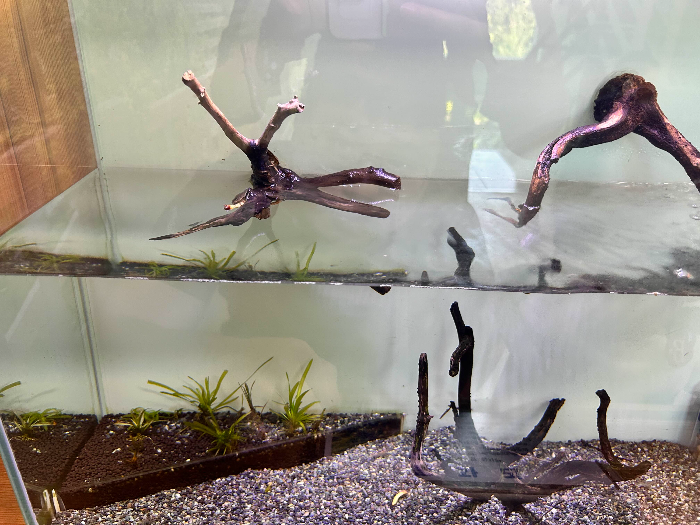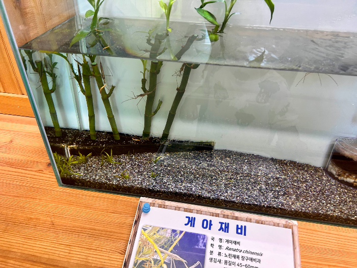 그리곤, 2층으로 올라가면 수서곤충들이 많이 있어요. 바닷속에 사는 사마귀인 물사마귀! 게아재비도 보이고요. 물방개, 애반딧불이 애벌레들이 있어요. 먹이를 먹고 있는 모습도 볼 수 있어서 흥미로웠어요. 수족관 앞에서 한참을 관찰하다 간 것 같아요.