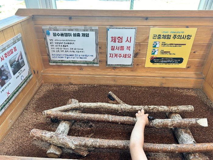 1층을 들어가면 바로 왼쪽에 장수풍뎅이를 바로 만날 수 있어요. 아이가 장수풍뎅이 등을 어루만져 주네요. 장수풍뎅이는 나무에 딱 달라붙어 있는데요. 너무 세게 떼어내려 하면 장수풍뎅이가 아플 수 있으니, 만질 때는 살살 만져주어야 해요.