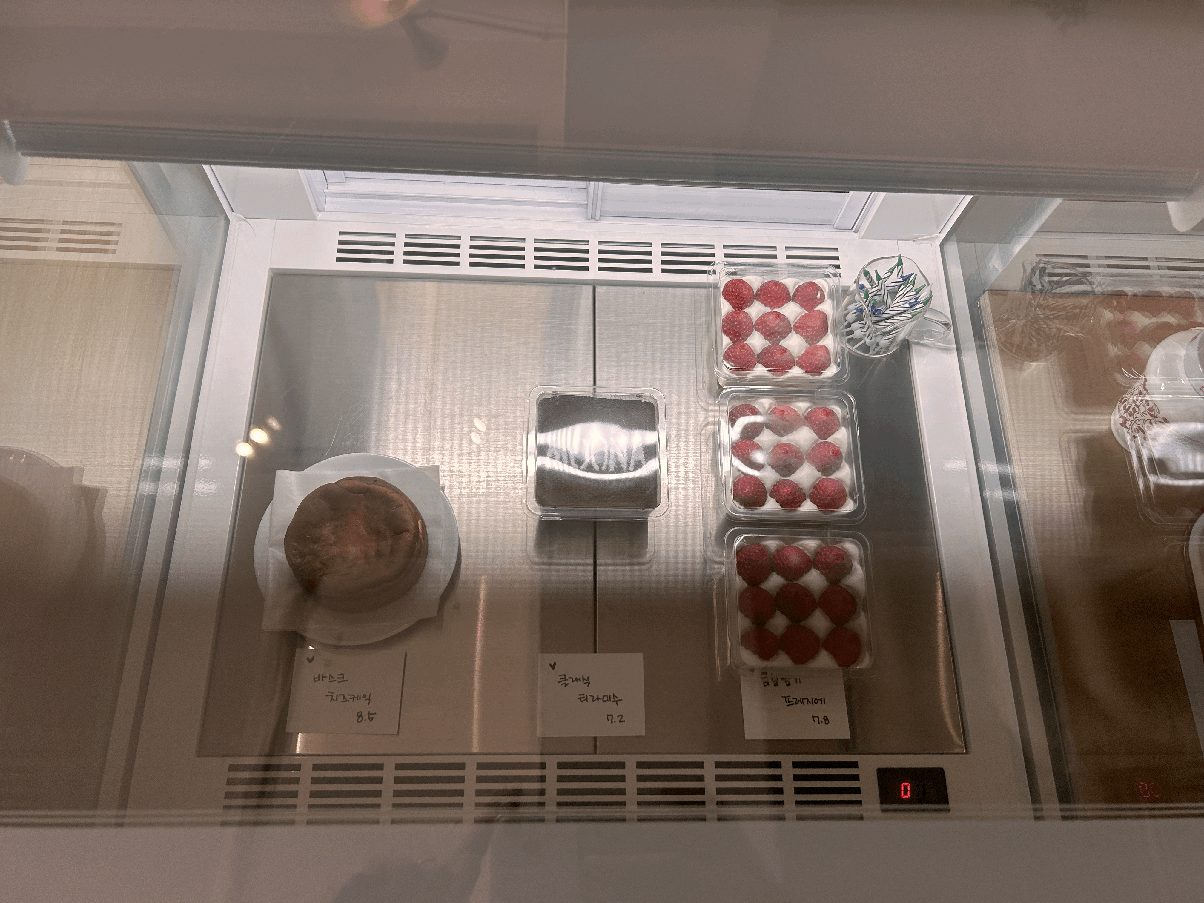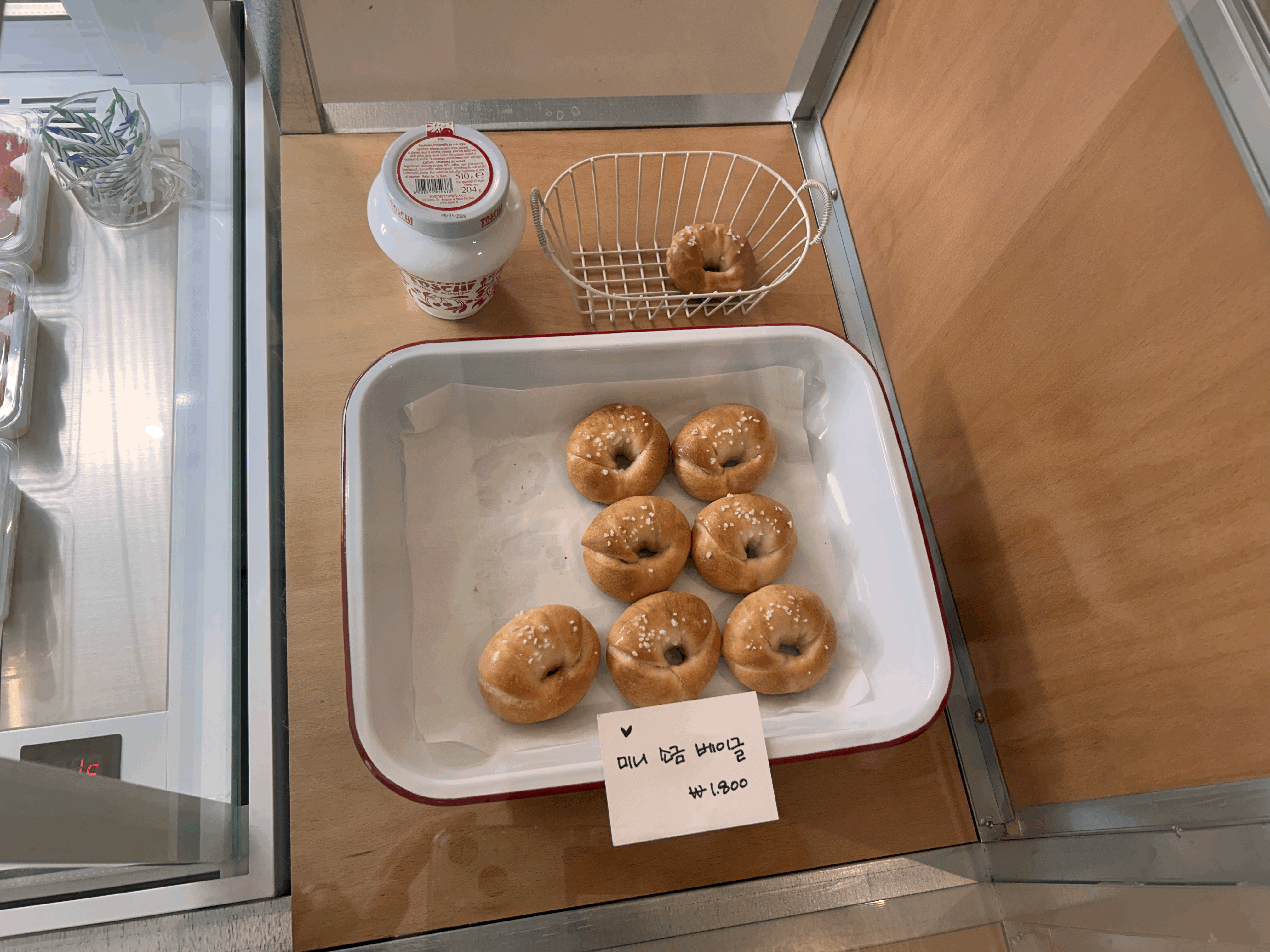 점심을 많이 먹고온 터라 따로 디저트는 시키지 않았는데, 딸기 케이크가 맛있어 보였다. 금실딸기가 올려진 프레지에인데 7800원이다. 요건 음료에 비해 조금 비싼 편. 그리고 또 옆칸에는 미니 소금 베이글이 있었는데, 정말 앙증맞고 귀여운 베이글이다. 이 미니 소금 베이글 가격은 1800원이고 다음에 와서 한번 먹어봐야겠다.