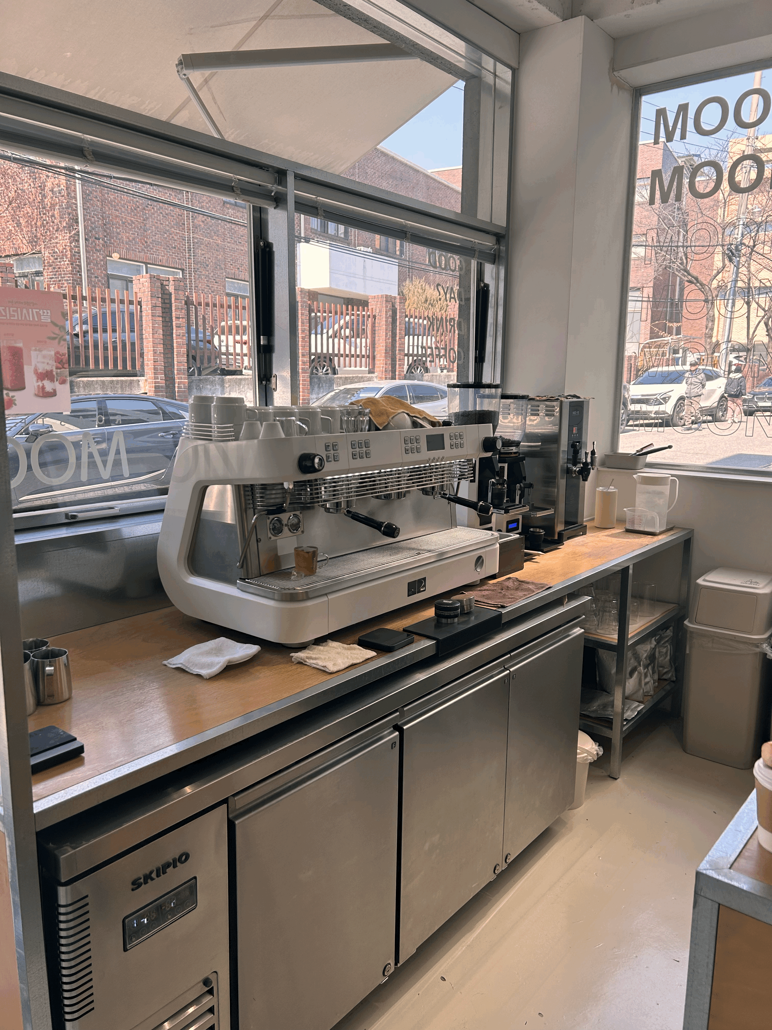 내부는 굉장히 모던하고 심플하게 꾸며져 있다. 매장 바로 입구 쪽에는 테이크 아웃 손님들을 위한 바 테이블도 있고 안쪽으로는 편히 앉을 수 있는 테이블이 많이 있다. 커피머신이 뭔가 예뻐서 눈에 띄었다.