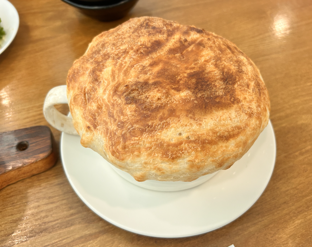 아주 만족스럽게 빵과 샐러드를 먹고 있으면, 스프가 나온다. 수프는 꽤 양이 많아서, 둘이 먹기에 적당하다. 그런데, 덜어먹는 그릇이 약간 안 어울리긴 했다. 플라스틱 그릇인데, 양식 레스토랑과는 좀 안 어울리는 느낌이랄까? 도자기로 바꾸면 어떨까 싶다. 더 맛이 좋을 것 같은 기분이다.
