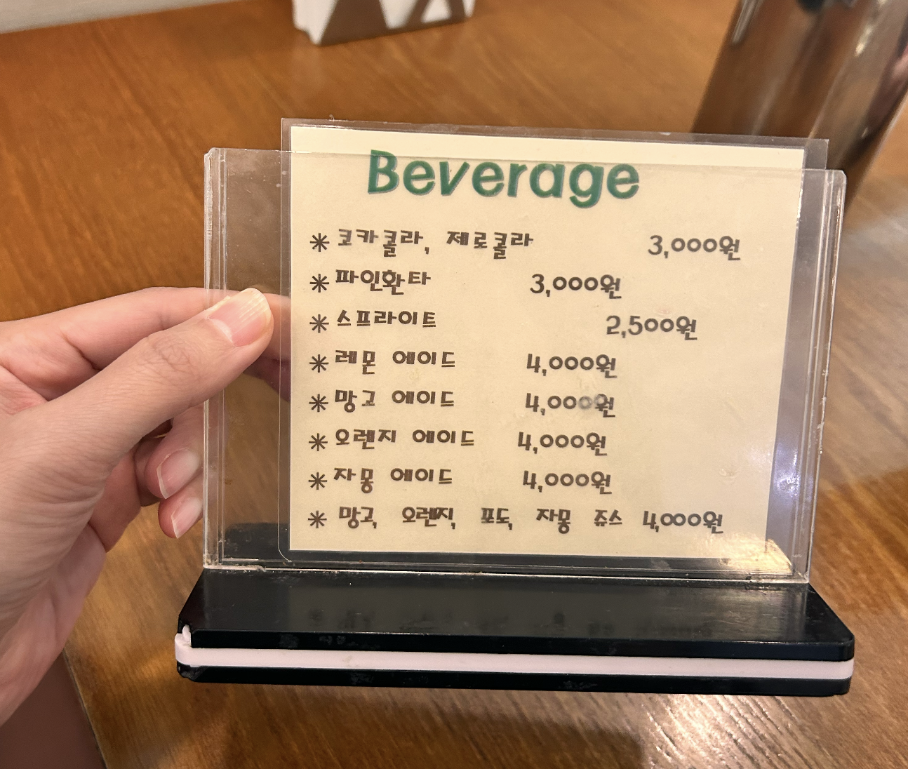 바질리코레스토랑은 커피가 셀프바로 운영되고 있어서, 기본으로 가져다 먹을 수 있다. 혹시 커피를 드시지 않는 경우, 따로 음료주문을 할 수 있는데 기본 탄산음료와 에이드 종류가 있다.