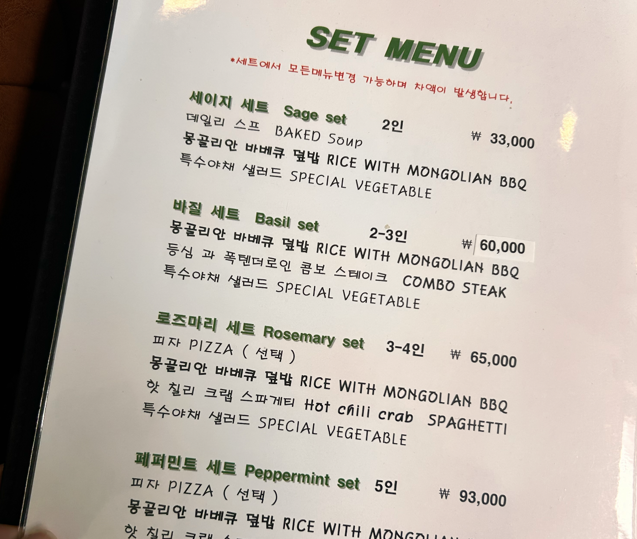 점심이라 가볍게 세트메뉴를 먹으려 한다. 2인 세트메뉴인 세이지 세트, 가격은 33,000원에다가 이곳은 커피까지 있으니 혜자로운 가격인 듯하다. 세트에 모두 몽골리안 베베큐 엎답이 들어가 있는 걸 보니 역시 이 집의 메인은 몽골리안 덮밥인 듯하다. 몽골리안 덮밥이 양이 정말 어마어마하다고 하는데 과연 어느 정도인지 궁금하다.