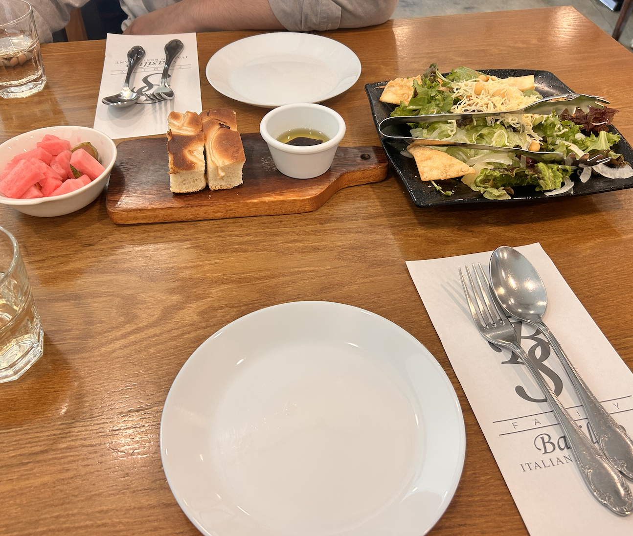 세이지세트를 시키니 가장먼저 식전빵과 피클이 나왔다. 그리고 이어서 바로 세트에 포함된 샐러드가 나왔다. 샐러드가 아주 신선하고 맛이 좋다. 상큼 달콤한 소스에 신선한 야채들이 많고, 콩도 들어있다. 식전빵은 따뜻하게 나오는 편이고, 찍어먹는 발사믹 소스도 넉넉하고 맛이 좋다.