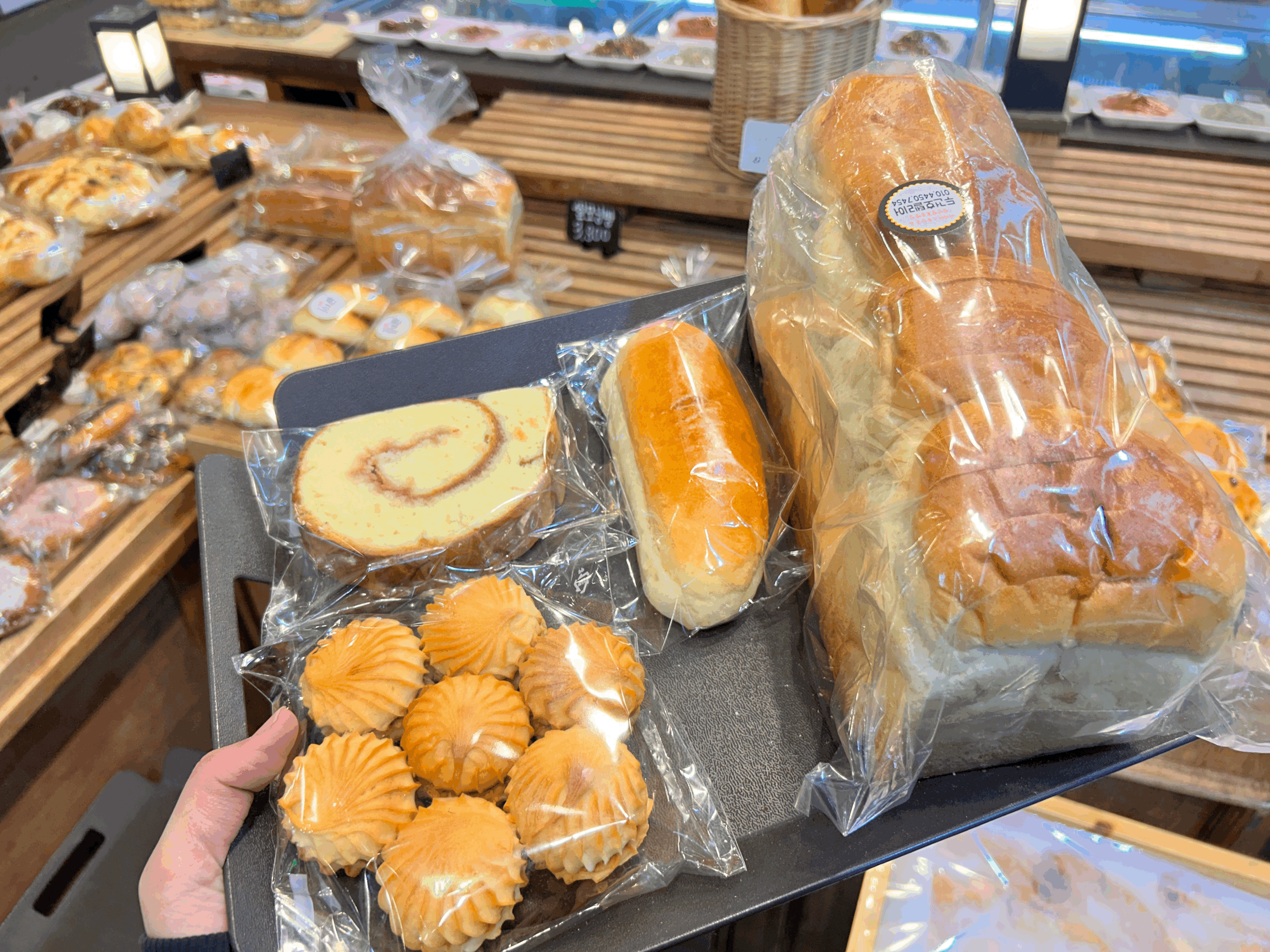식빵들도 많았는데, 가성비가 정말 좋다. 엄청 기다란 식빵이 4천 원!!! 프랜차이즈 빵집에서는 이거 반 크기에 같은가격이니 정말 가성비 좋다. 아이가 요즘 식빵에 딸기잼을 발라먹는 걸 좋아하는데, 해주기 위해 구입!