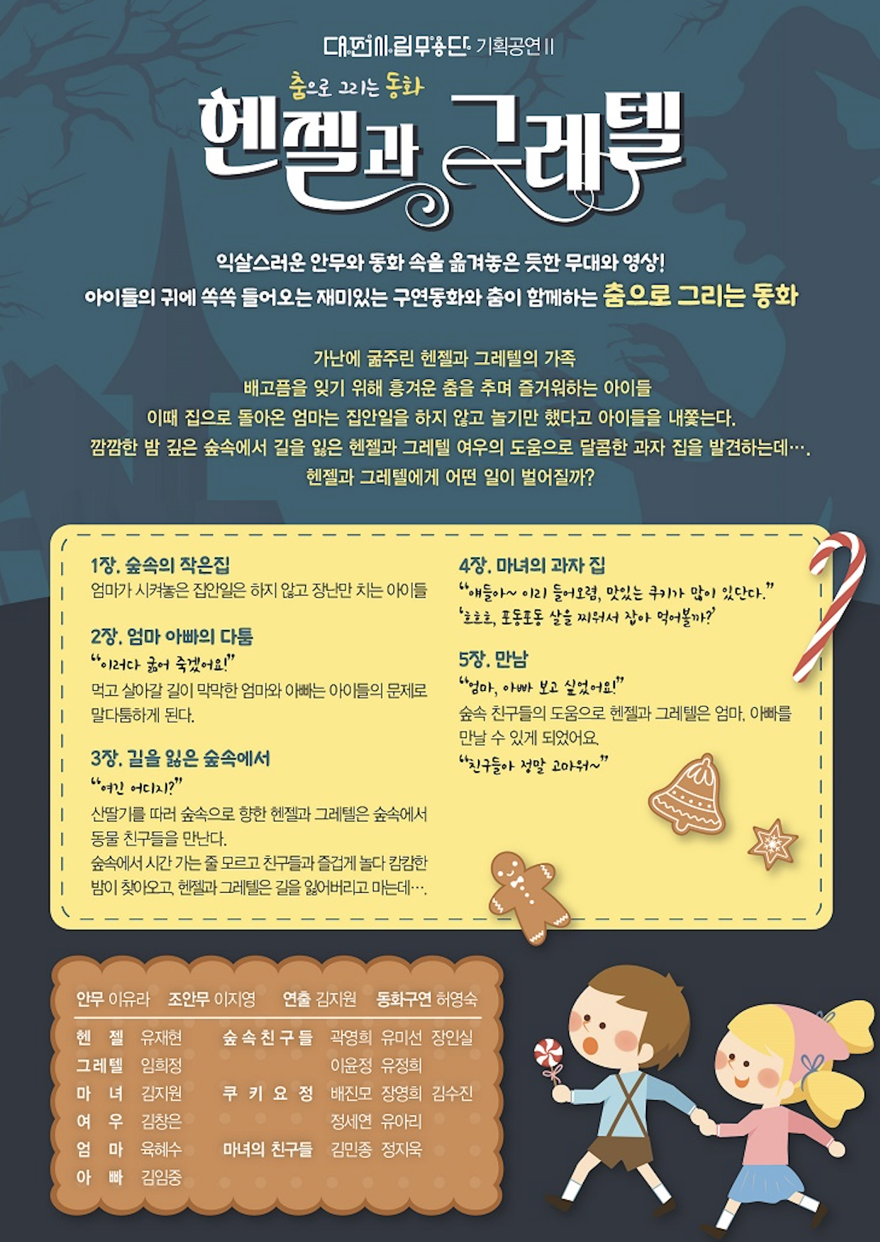 4월은 아이들과 어딘가로 떠나기 정말 좋은 계절이죠. 나들이를 떠나는 것도 좋겠지만, 선선한 봄날 공연을 보러 가보는 건 어떨까요? 대전예술의전당 앙상블홀에서 펼쳐지는 춤으로 그리는 동화 '헨젤과 그레텔' 공연이 예정되어 있습니다. 공연과 함께 풍성한 봄날을 즐겨보는 건 어떨까요? 자세한 정보를 알아보겠습니다.