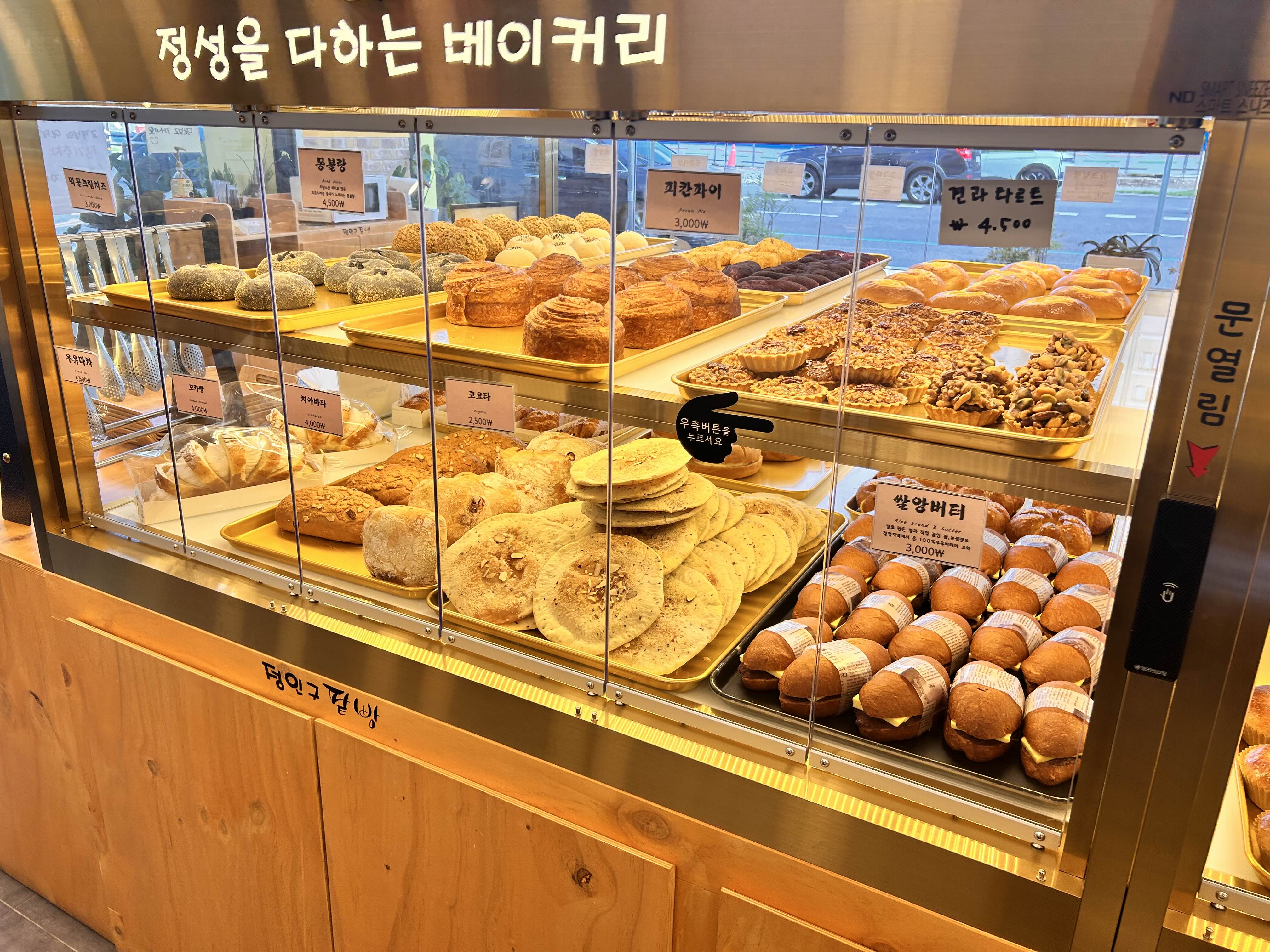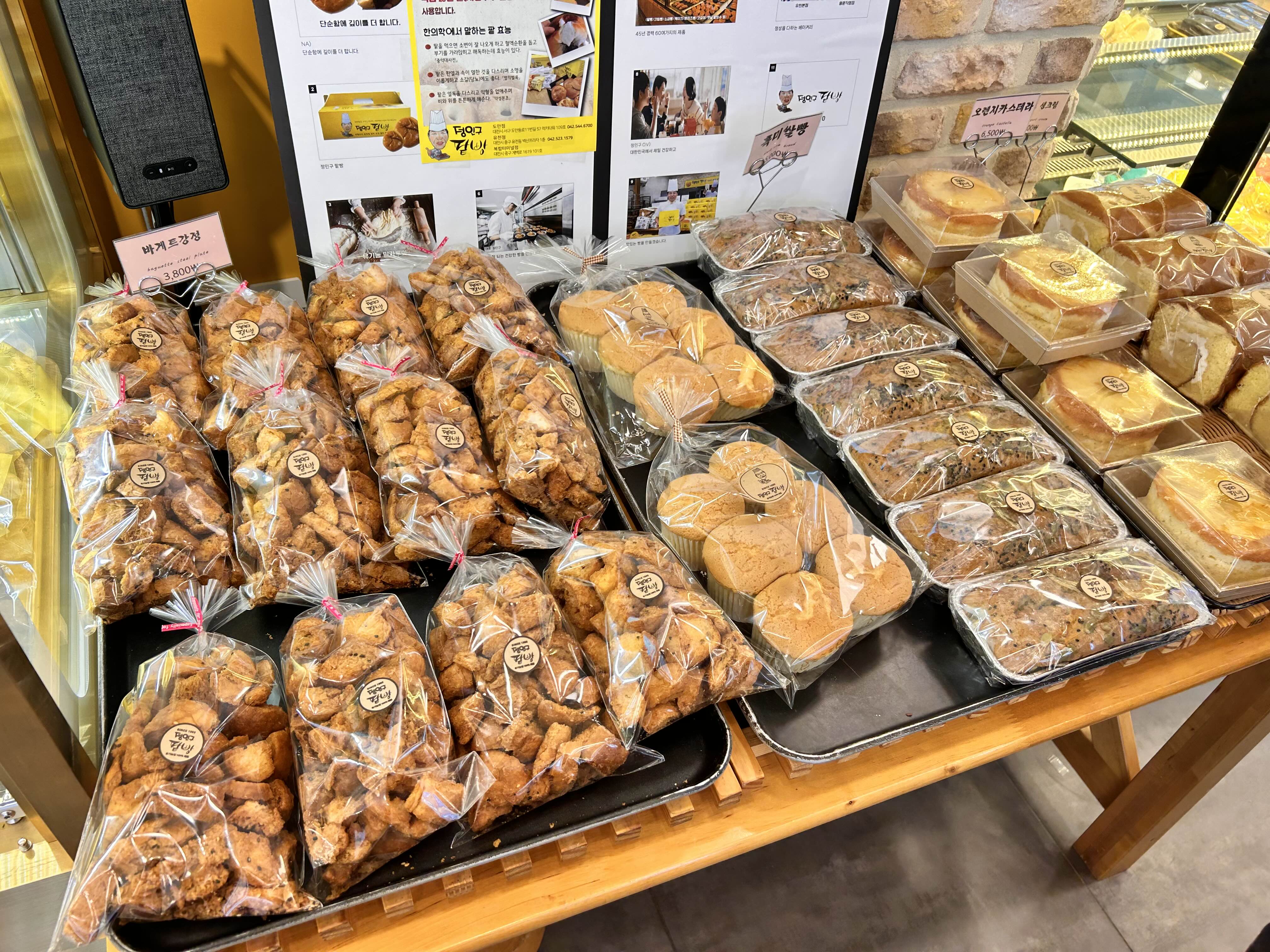 매장 내부가 정말 밝고 깨끗해서 놀랬어요. 빵들도 안쪽에 보관되어 있어서, 정말 위생적으로 보이더라고요. 빵 종류도 정말 많아요. 이곳에서 제일 유명한 팥빵, 야채빵 뿐만 아니라, 베이글, 깨찰빵, 쫀득이빵, 마늘바게트 등 없는 빵이 없어요.