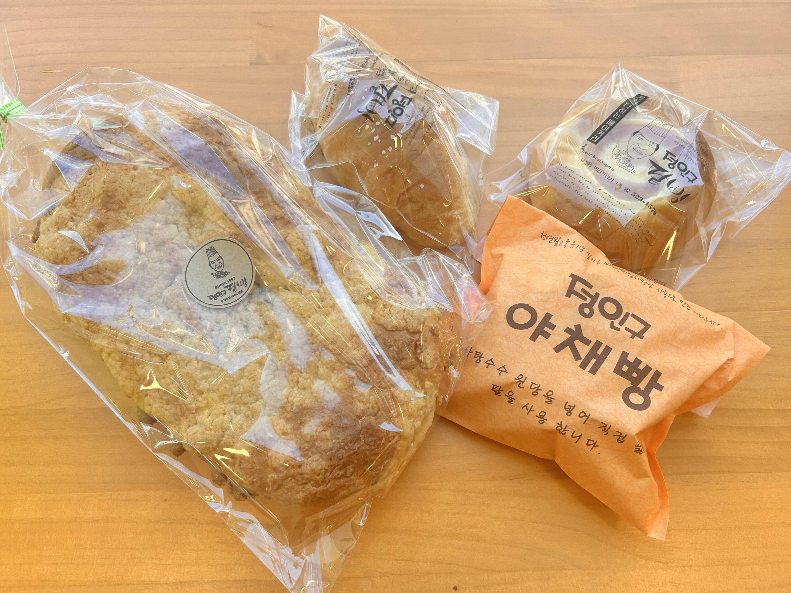 남편은 맘모스빵, 저는 야채빵, 아이를 위해 슈크림빵을 구매했어요~! 그리고 소금빵도 하나 추가구입!