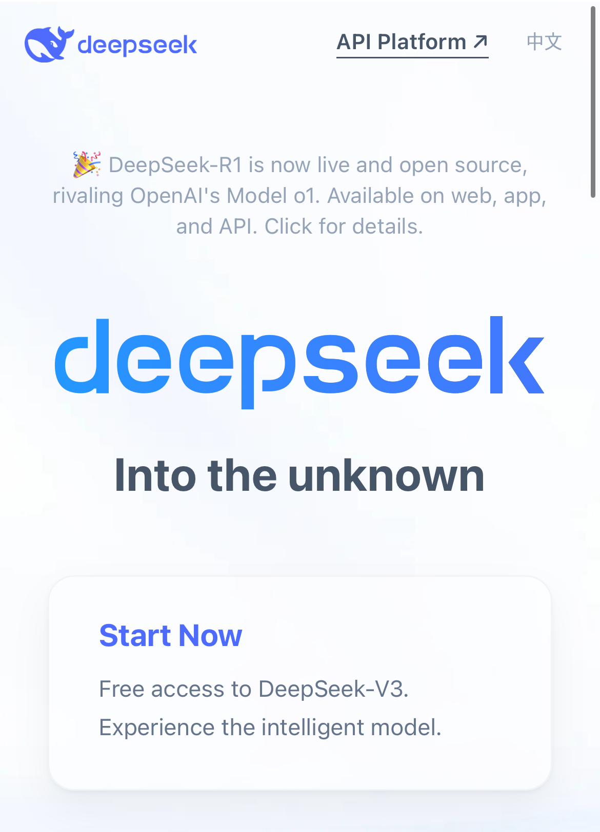 맨 위의 사이트를 클릭하면 오픈 AI 모델 01과 경쟁하는 오픈소스가 되었다는 멘트와 함께, 앱과 웹상에서 이용이 가능하다고 소개하고 있습니다. 아래의 Start now를 누르면 AI와 이야기를 할 수 있는 것 같아, 클릭해 봅니다.