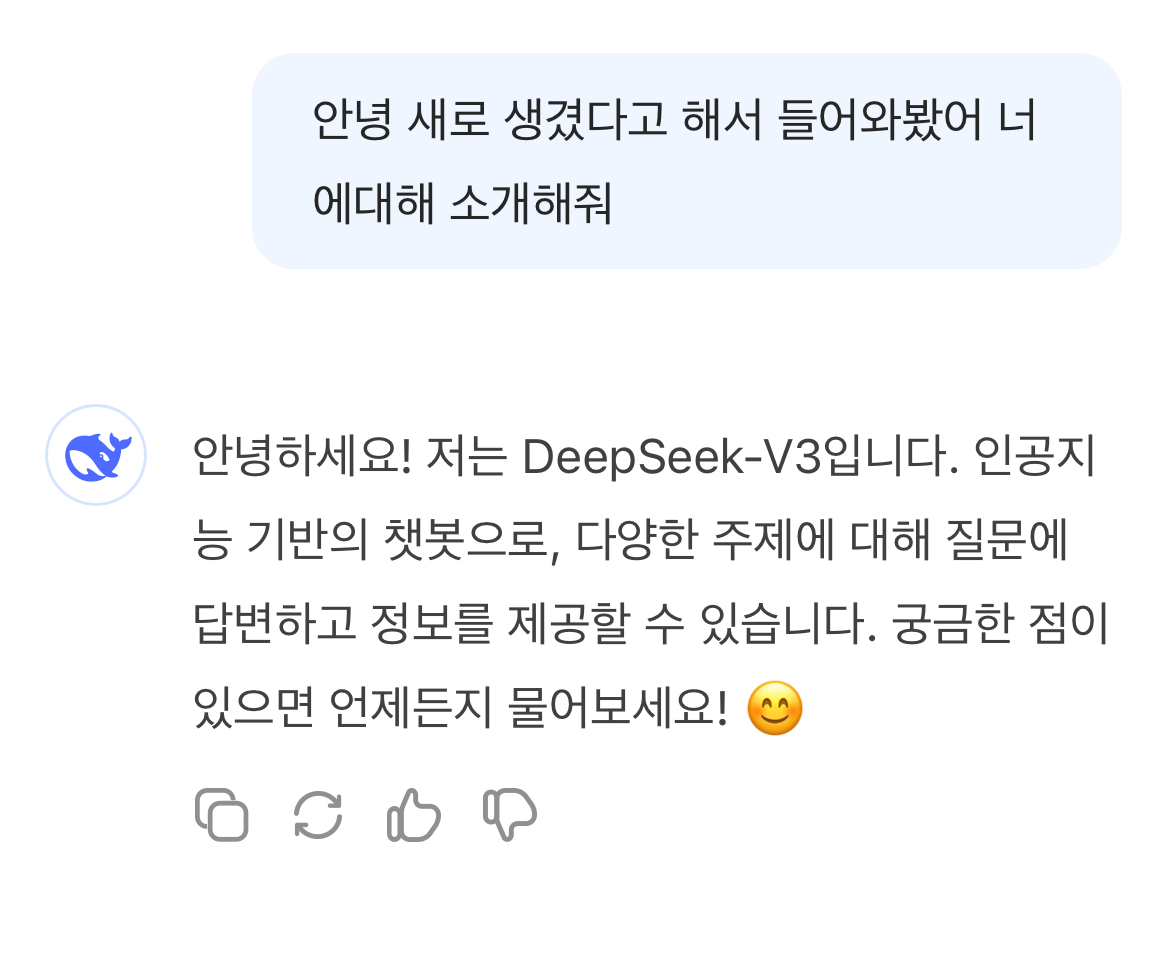 deepseek 딥시크 본인에 대해 소개해 달라고 요청하였습니다. 발랄하게 답해주는 deepseek 녀석이네요. DeepSeek-V3이며, 인공지능 기반의 챗봇으로 다양한 주제에 대해 답변할 수 있으며 정보를 제공해준다고 대답해주고 있습니다. 궁금한 점이 있으면 언제든지 물어보라고 해주니 왠지 믿음직스러워 보이기도 합니다.