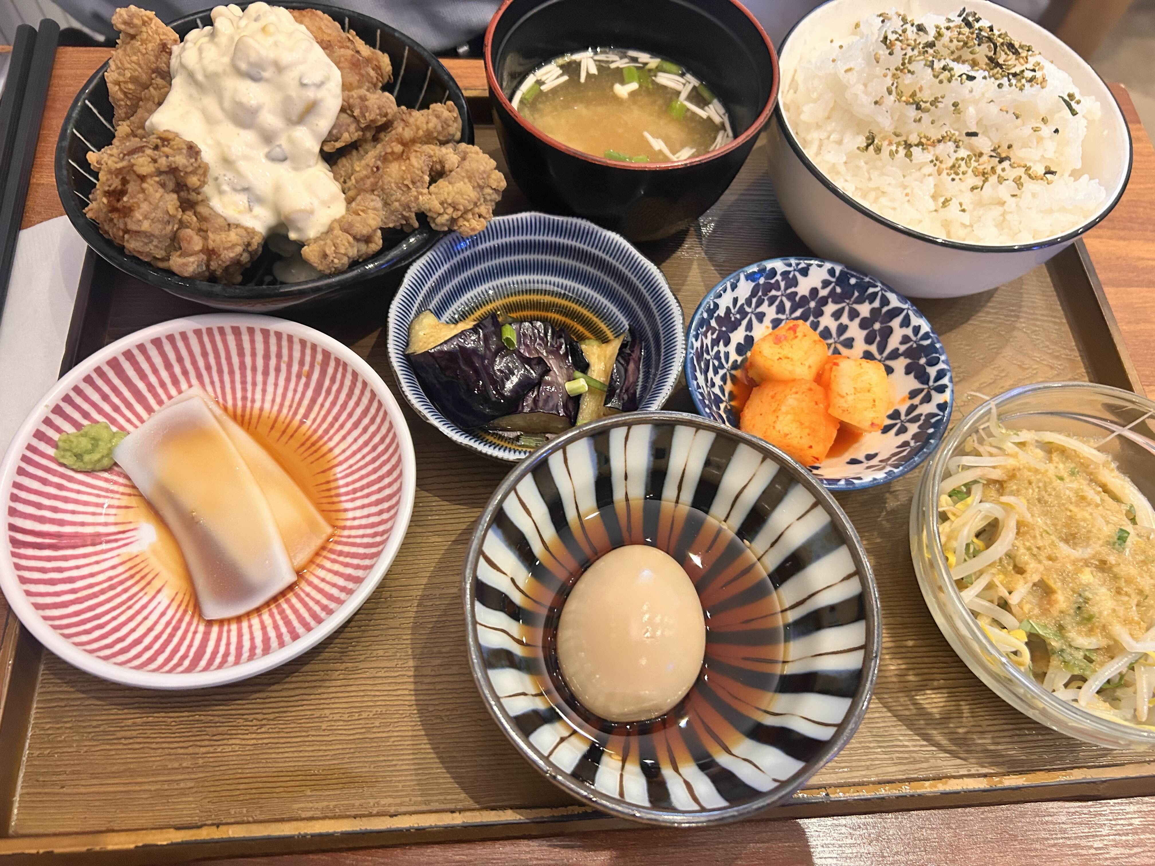 웨이팅을 할때 메뉴를 미리 주문해 놔서 그런지 생각보다 식사가 일찍 나와서 좋았다. 점심시간이 있으므로 후다닥! 치킨 오반자이는 반찬이 꽤 여러 개가 나온다. 메인인 치킨 튀김과 가지나물, 숙주나물, 깍두기, 계란 그리고 떡처럼 생긴 하얀 색깔의 반찬인데 먹어보니 아마 오징어인 듯 싶다. 오징어가 어떻게 저렇게 네모나게 만들어진 건지는 알 수 없으나 신기한 맛이었다.