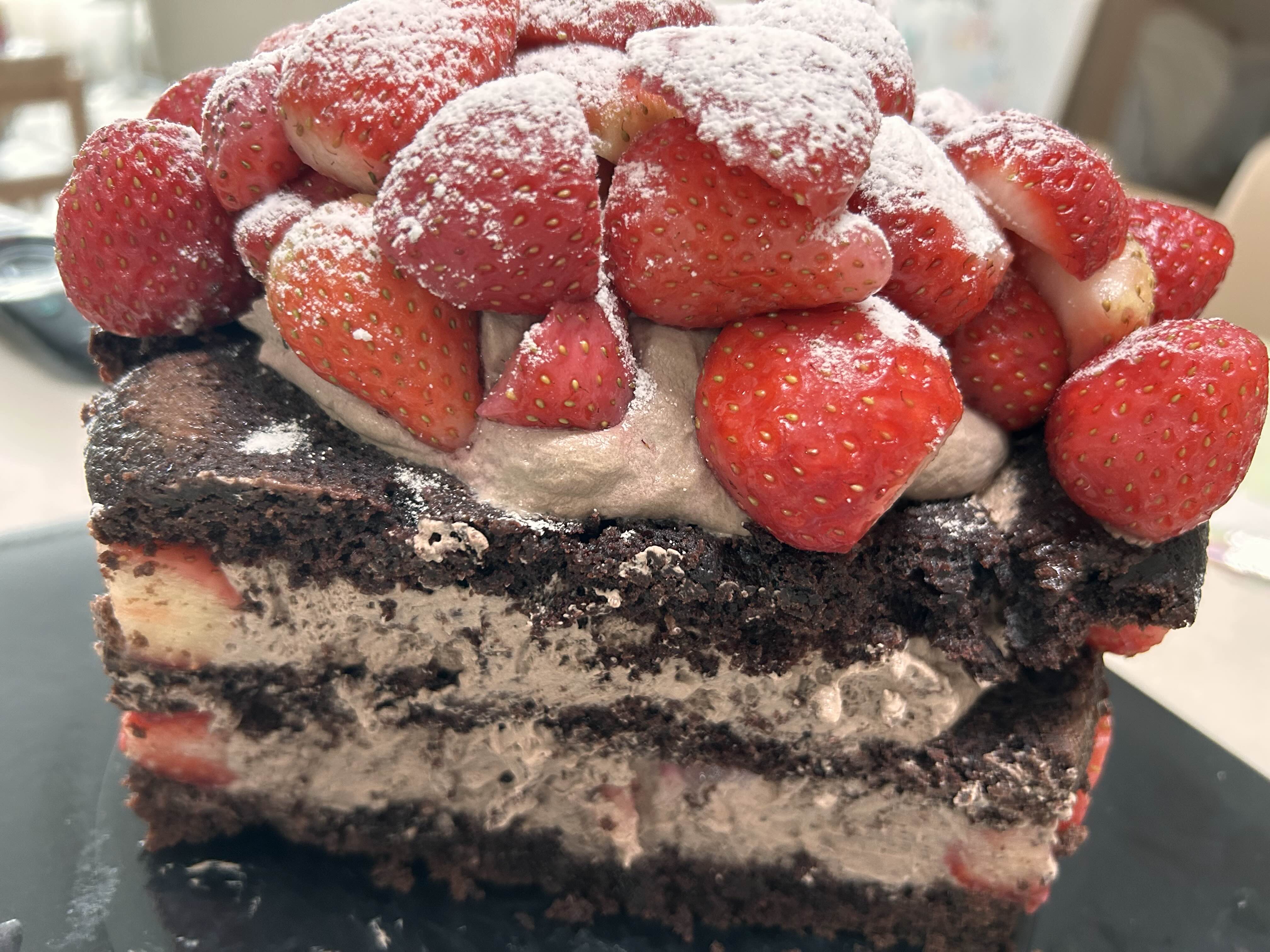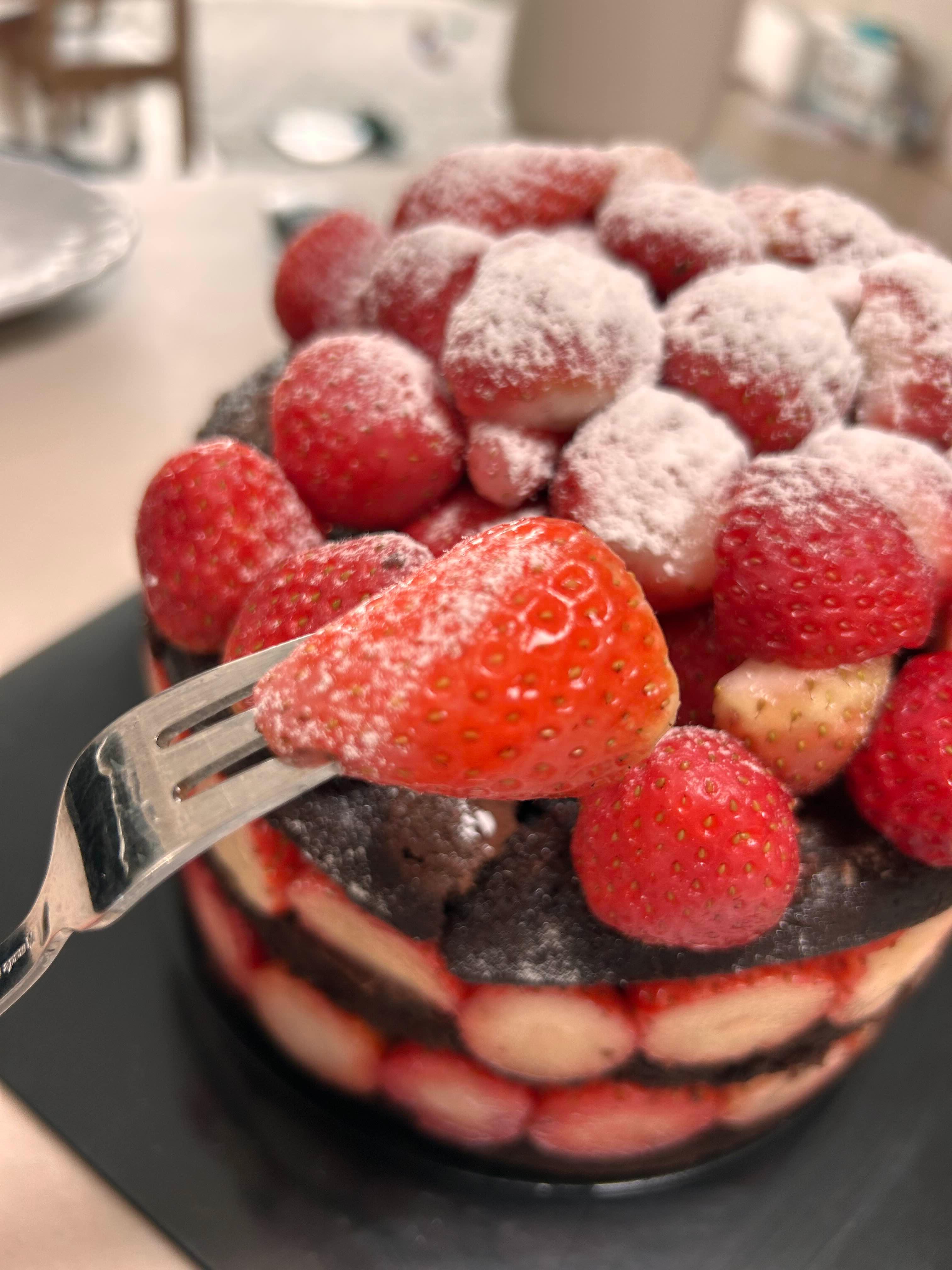 결국, 자르지는 못하고 가장자리 위에 놓인 딸기부터 조금씩 먹어봅니다. 달콤하고 상큼! 딸기아래쪽에는 초코크림으로 고정되어 있고요. 안쪽의 빵은 브라우니예요. 꾸덕하고 힘 있는 브라우니덕에 딸기의 무게를 버텨주는 것 같았어요.