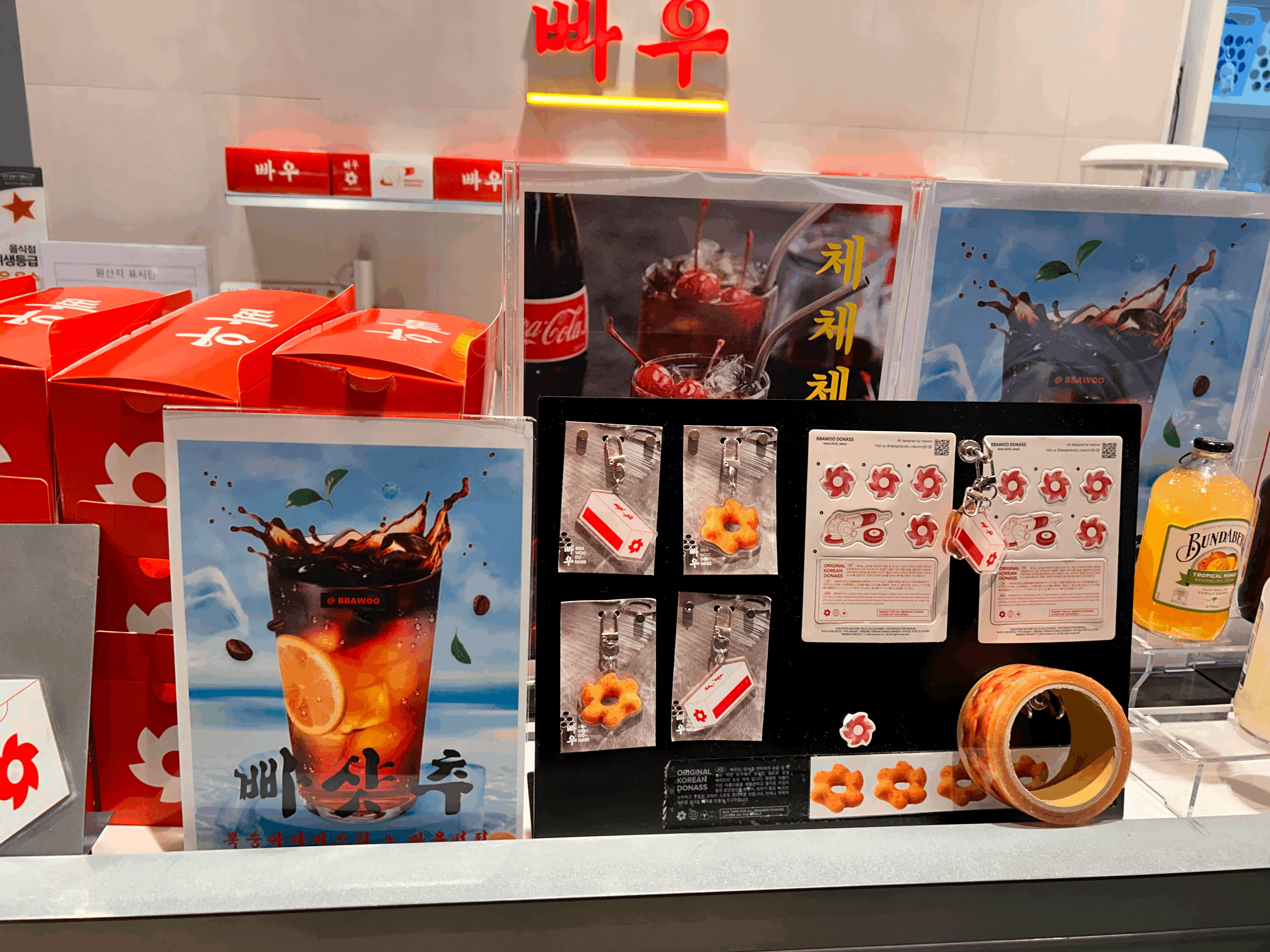 도넛은 다섯종류 이지만, 음료는 더 종류가 많았어요. 병음료로 많이 있고 체리코크, 빠우식혜, 빠우커피 등이 있습니다. 빠우식혜랑 도너스 같이 먹으면 왠지 맛있을 듯. 그리고, 굿즈도 판매하는 모습이었어요. 열쇠고리와 테이프도 있네요. 도너스 모양 열쇠고리가 귀엽네요.