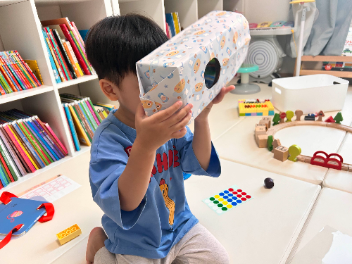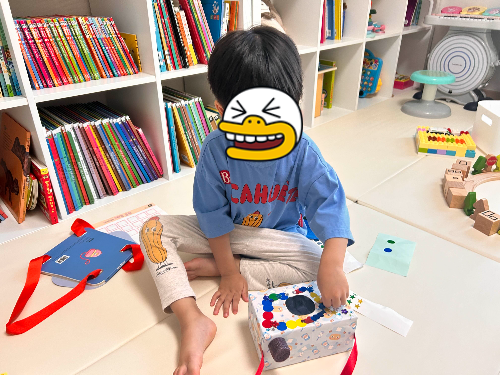 구멍을 내고 자르는건 가위를 써야 해서, 제가 단독으로 했지만요. 포장지를 함께 씌우며 붙이는 작업을 같이 해보았는데 아이가 흥미로워하더라고요. 다 붙이지도 않았는데, 벌써 신났는지 카메라 찍는 시늉을 하더라고요.