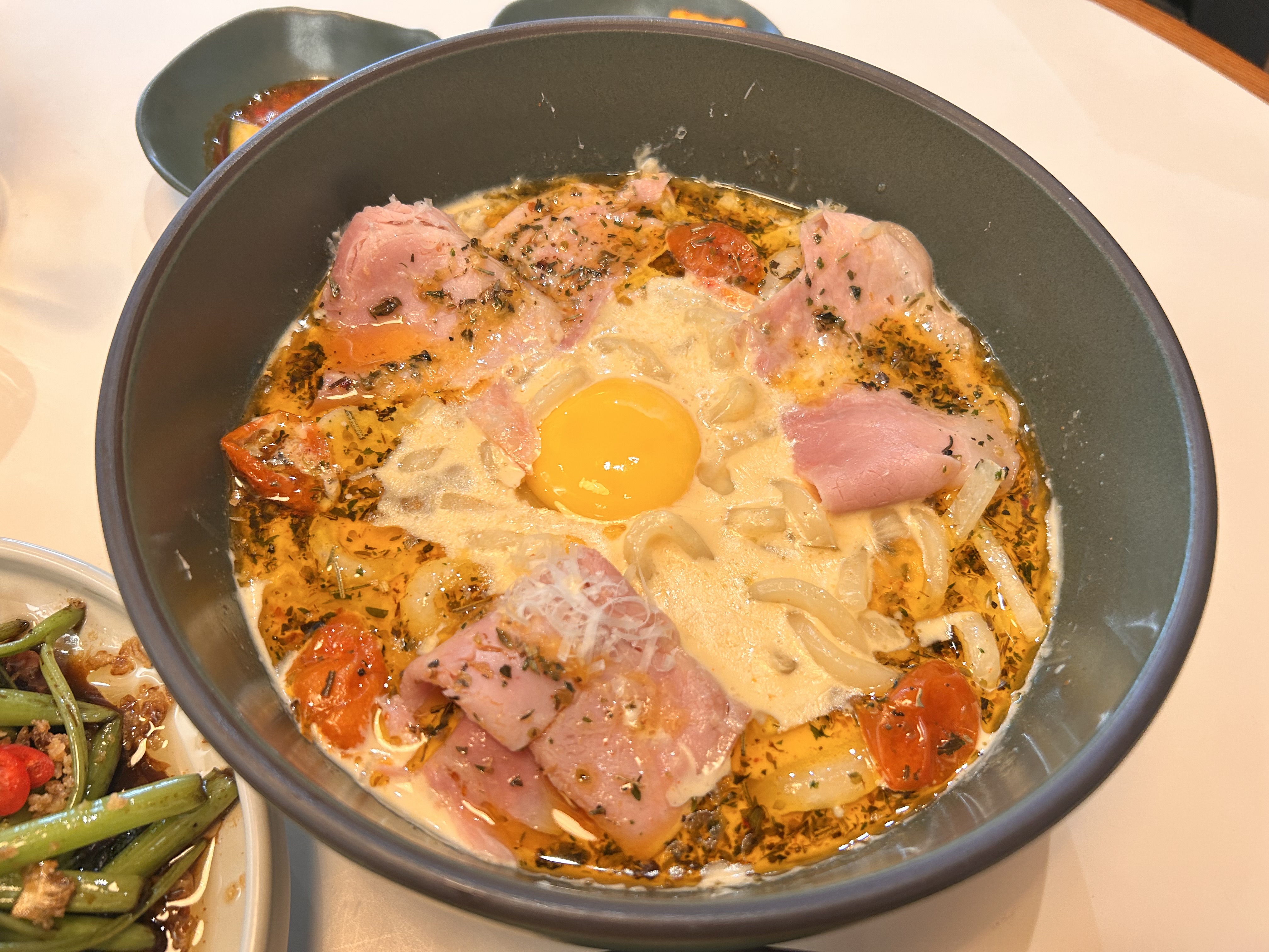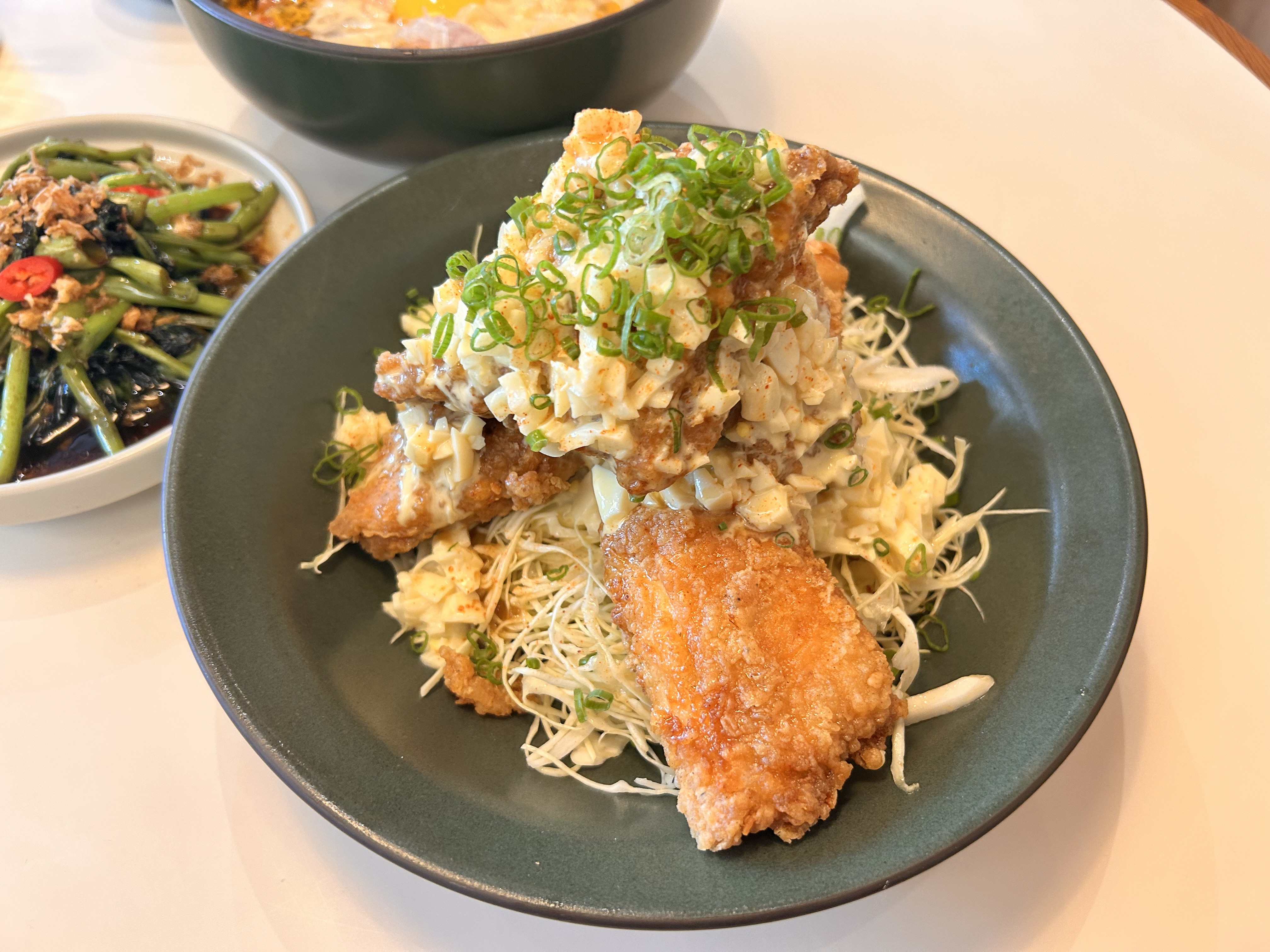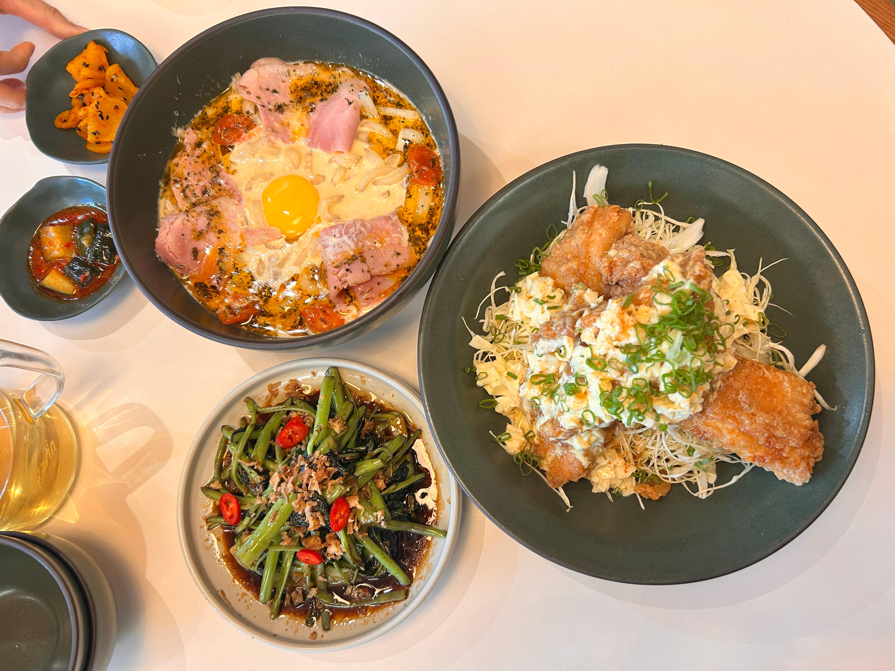 메뉴는 메인을 두개 시키고, 사이드를 하나 시켰다. 잠봉크림누들, 치킨난반 그리고 모닝글로리다. 여자 둘이서 좀 많긴 한데 욕심을 좀 부렸다. 완전 먹음직스러워 보인다.