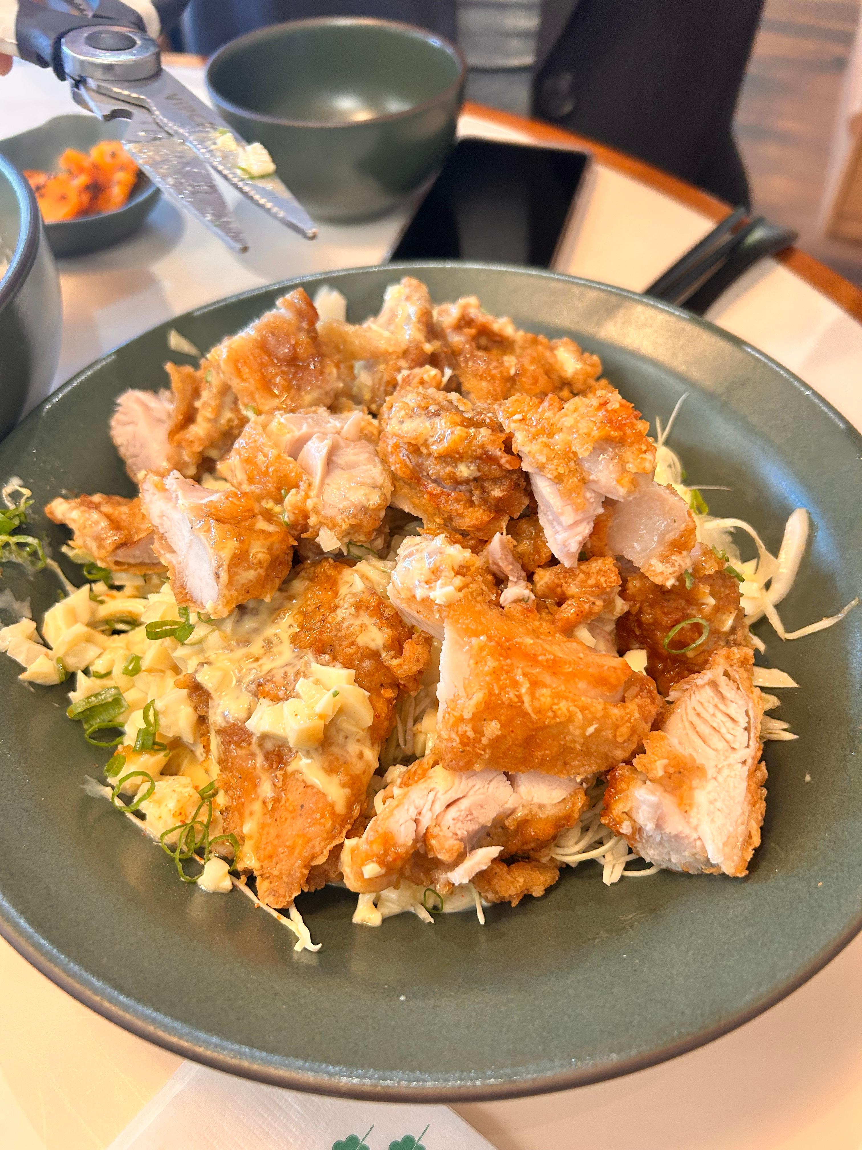 양배추 샐러드 위에 치킨이 한가득 올려있다. 그 위로 망고겨자 소스가 뿌려져 있는데, 겨자맛이 그렇게 강하지 않고 달달하면서도 살짝 매운맛이 느껴져서 맘에 들었다. 양이 상당히 많다.