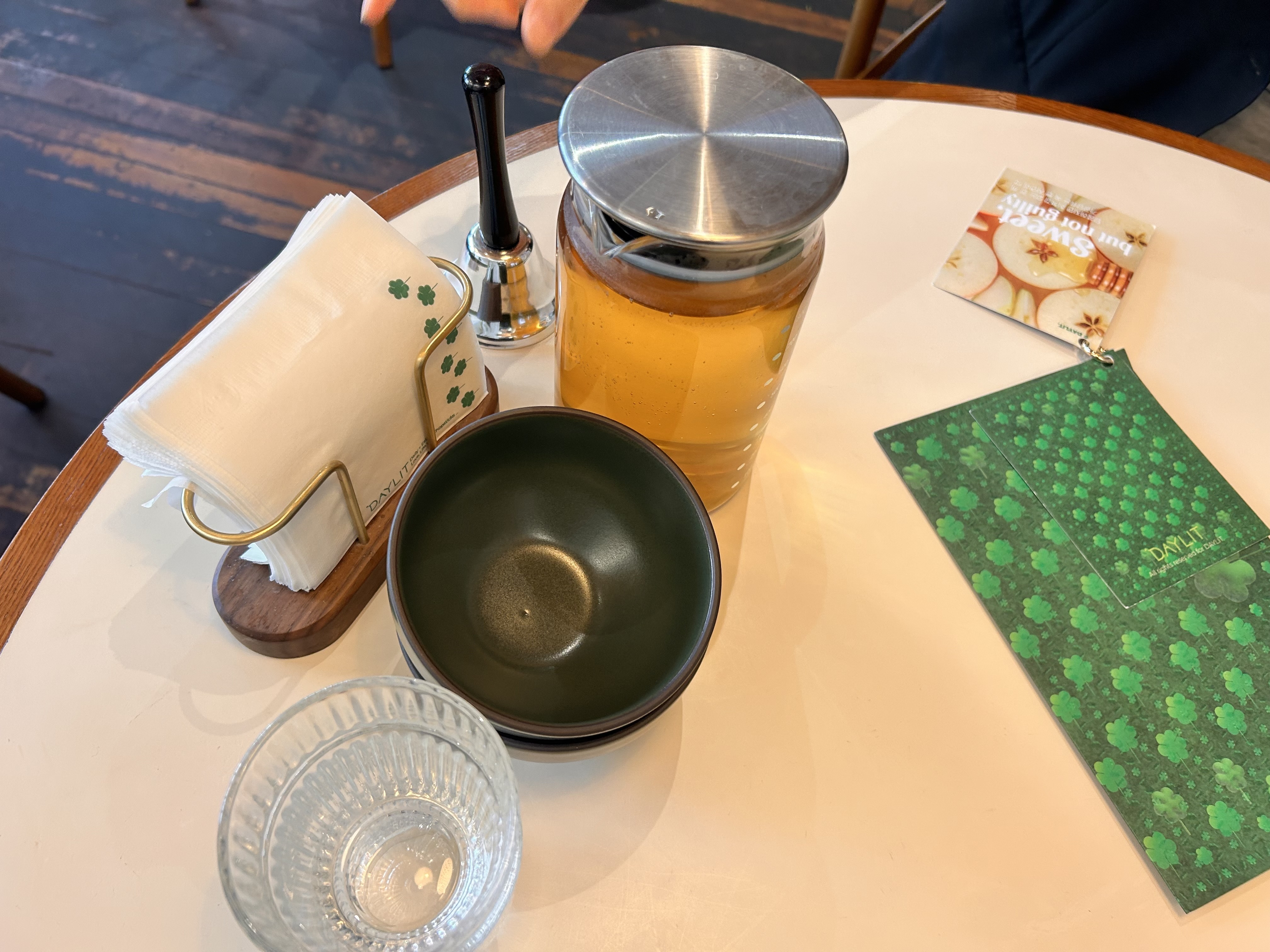 초록색으로 꾸며진 예쁜 메뉴판으로 식사를 고른 후, 직접 종을 들어서 직원을 호출했다. 요즘 보기 드문 호출 시스템이라 약간 민망하면서도 재밌었다.