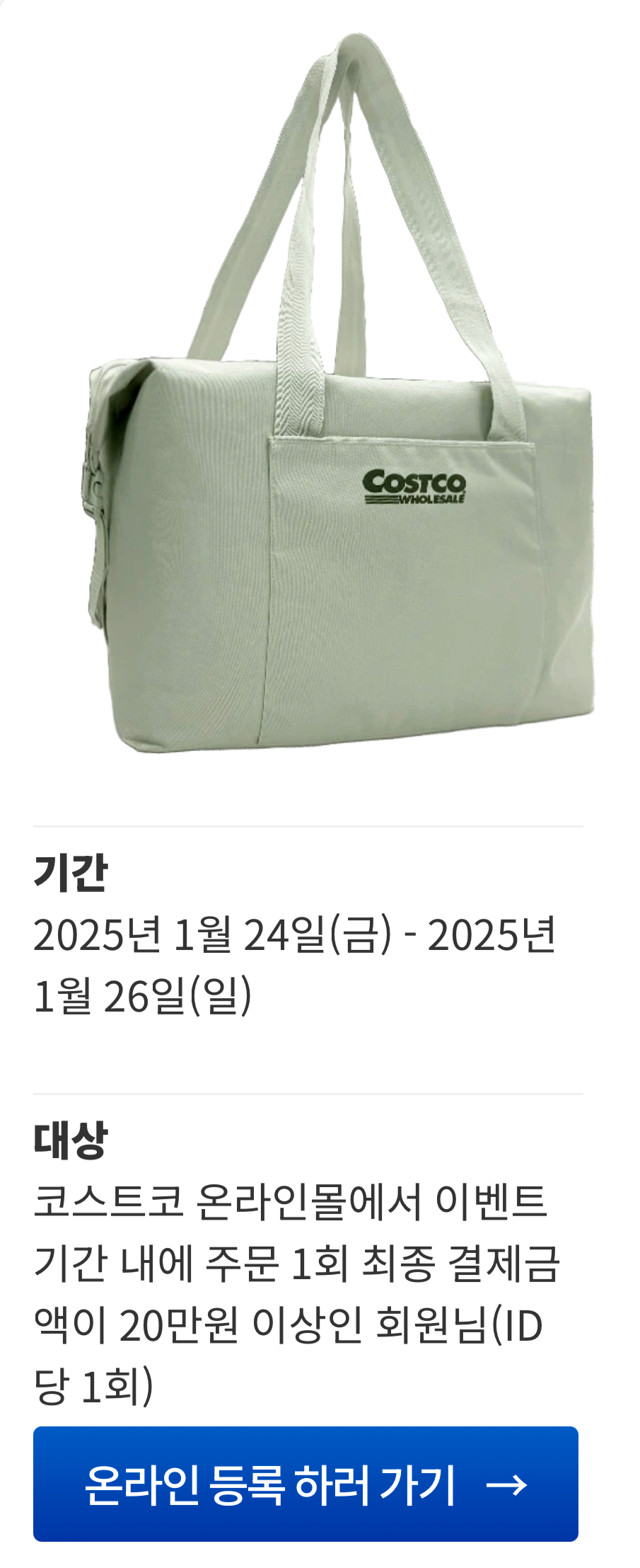 코스트코는 로고가 박힌 자체 쇼퍼백 쇼핑백이 있죠. 회원가입 시에 보통 한 개씩 받을 수 있고, 자동이체를 하게 되면 보냉팩까지 받을 수가 있어요. 물론 코스트코 매장에서 직접 쇼퍼백 구매도 가능합니다. 제가 가입했을 시절에는 보냉팩을 주진 않았는데, 요즘은 바뀌어서 보냉팩을 주더라고요. 그런데, 기존 고객에게는 보냉팩을 주지 않아서 좀 서운한 마음이 있었습니다. 보냉팩을 어떻게 구할 수 있을까 했는데, 온라인몰에서 마침 이벤트 기간이 있어서 보냉팩을 받을 수 있었어요. 이번 글에서는 코스트코 사은품 더플 쿨링백에 대해 알아보겠습니다.