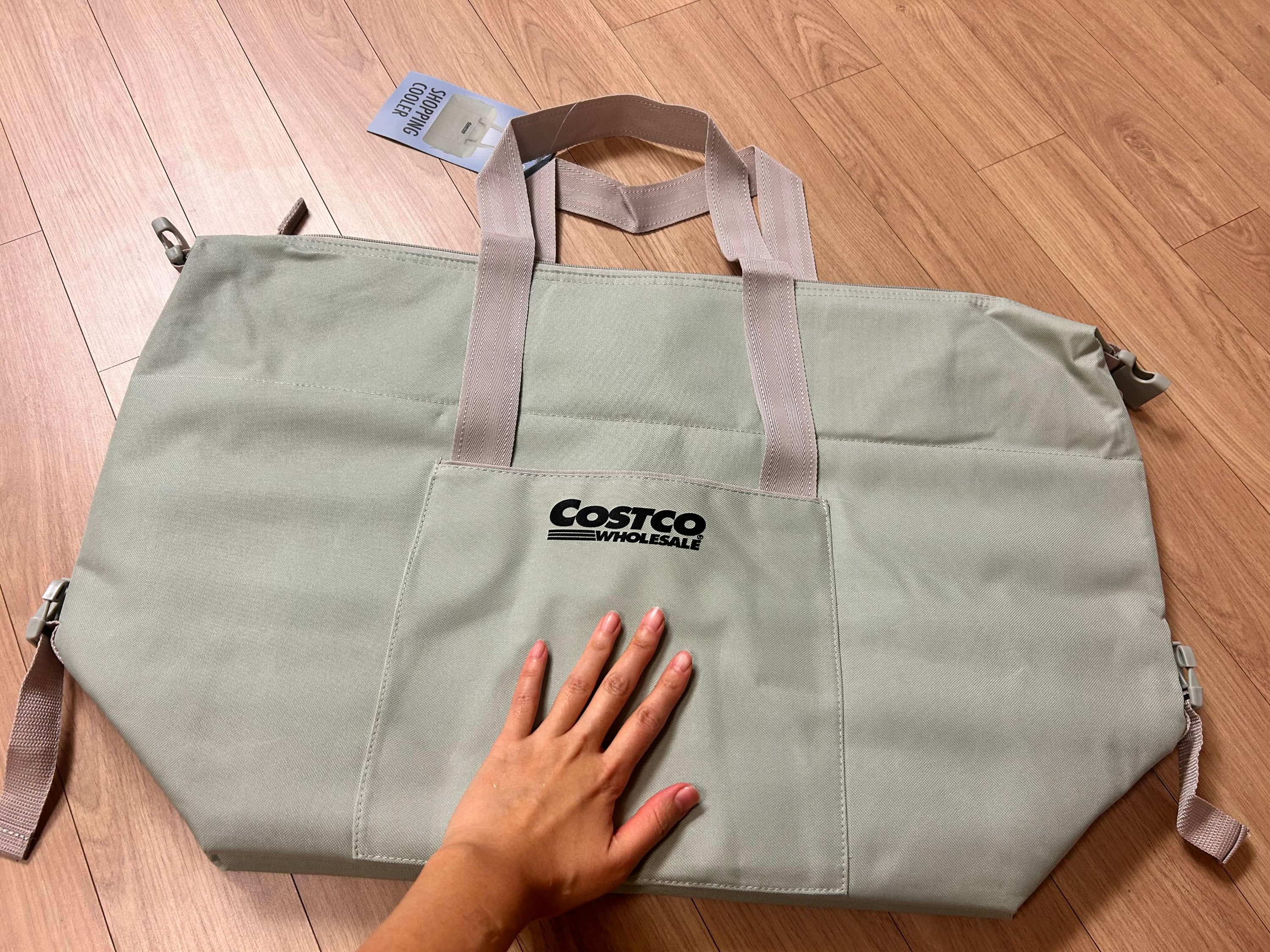 집에 있는 코스트코 쇼핑백과 비교해 보니 쇼핑백보다도 큰 사이즈예요. 코스트코 보냉백 너무 갖고 싶었는데 색상이랑 디자인까지 이쁜 보냉팩이 와서 넘 맘에 들었어요. 보냉백 옆라인에 있는 벨트를 묶어주면 직육면체 모양이 되는데요.