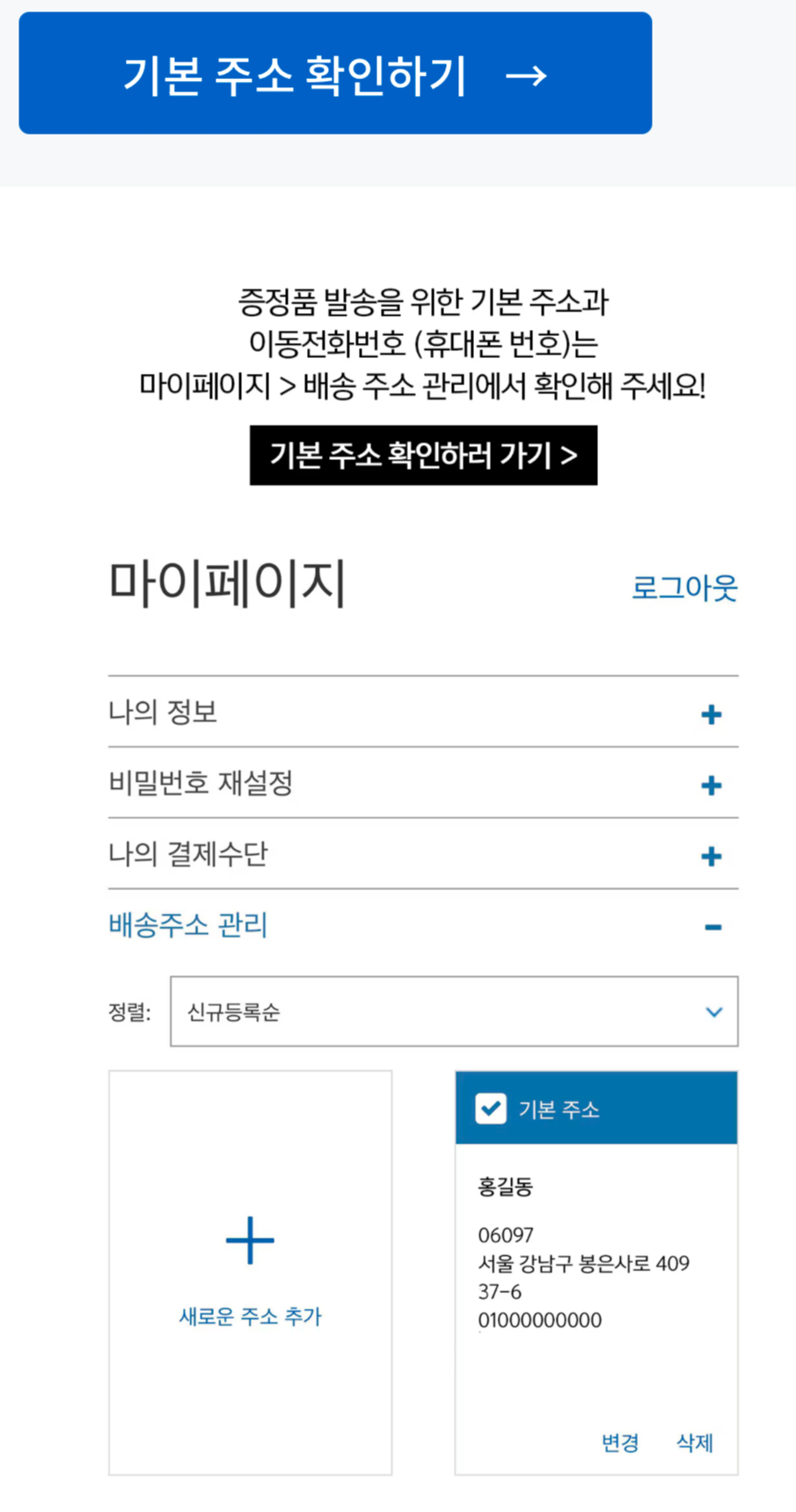 마이페이지 > 배송주소 관리 로 들어가서 기본주소를 제대로 설정해 줍니다.