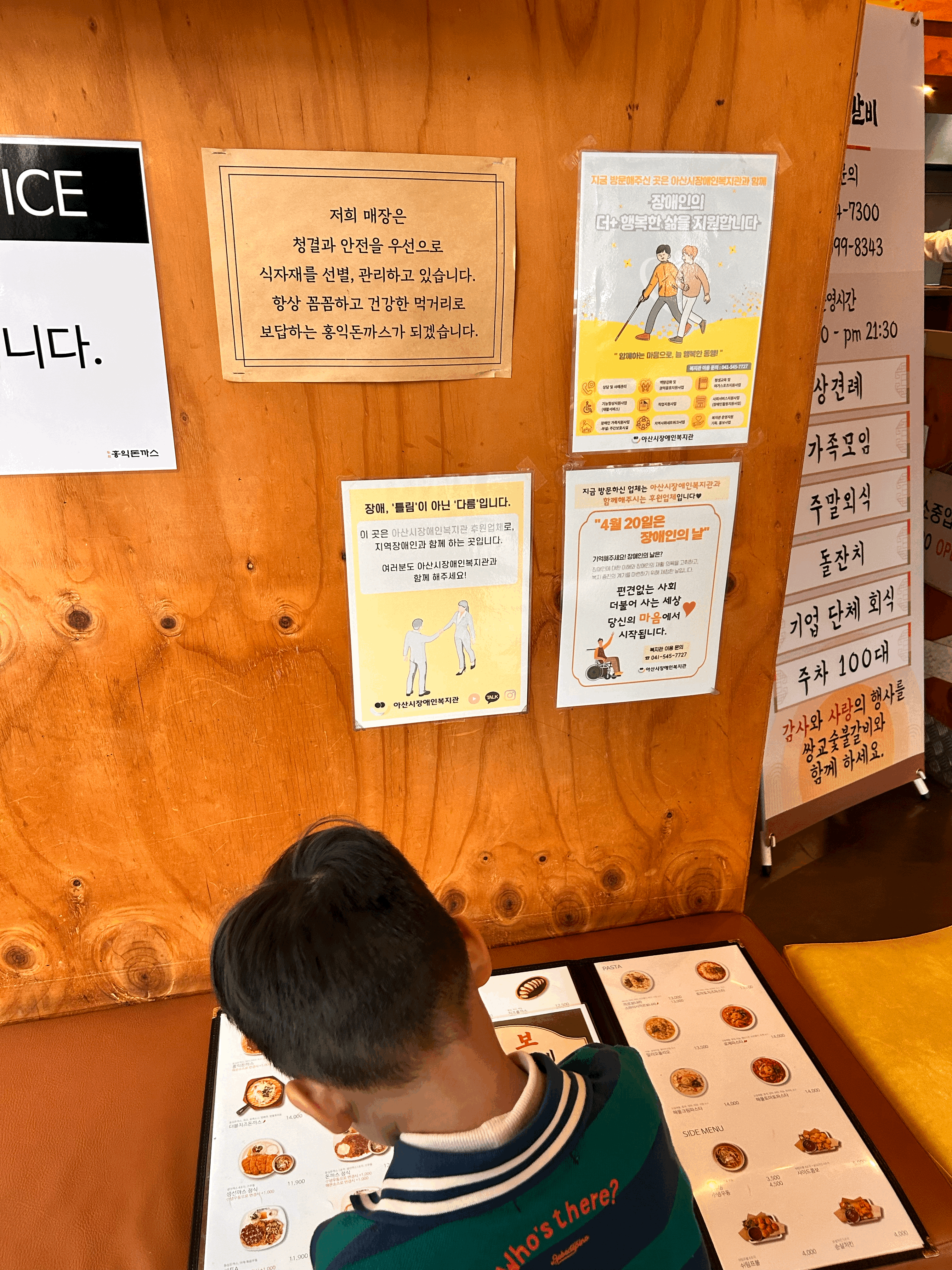겨울이라 대기 공간에 예쁜 크리스마스트리도 놓여 있고요. 대기하는 동안 메뉴판을 보며 메뉴를 정하고, 직원이 오면 고른 메뉴를 알려드렸어요. 그리고 이곳 매장의 특징으로는 지역장애인과 함께 하는 점이었어요. 장애인의 행복한 삶을 지원한다니 의미 있는 일을 한다는 생각에 더 정이 가는 곳이었어요.