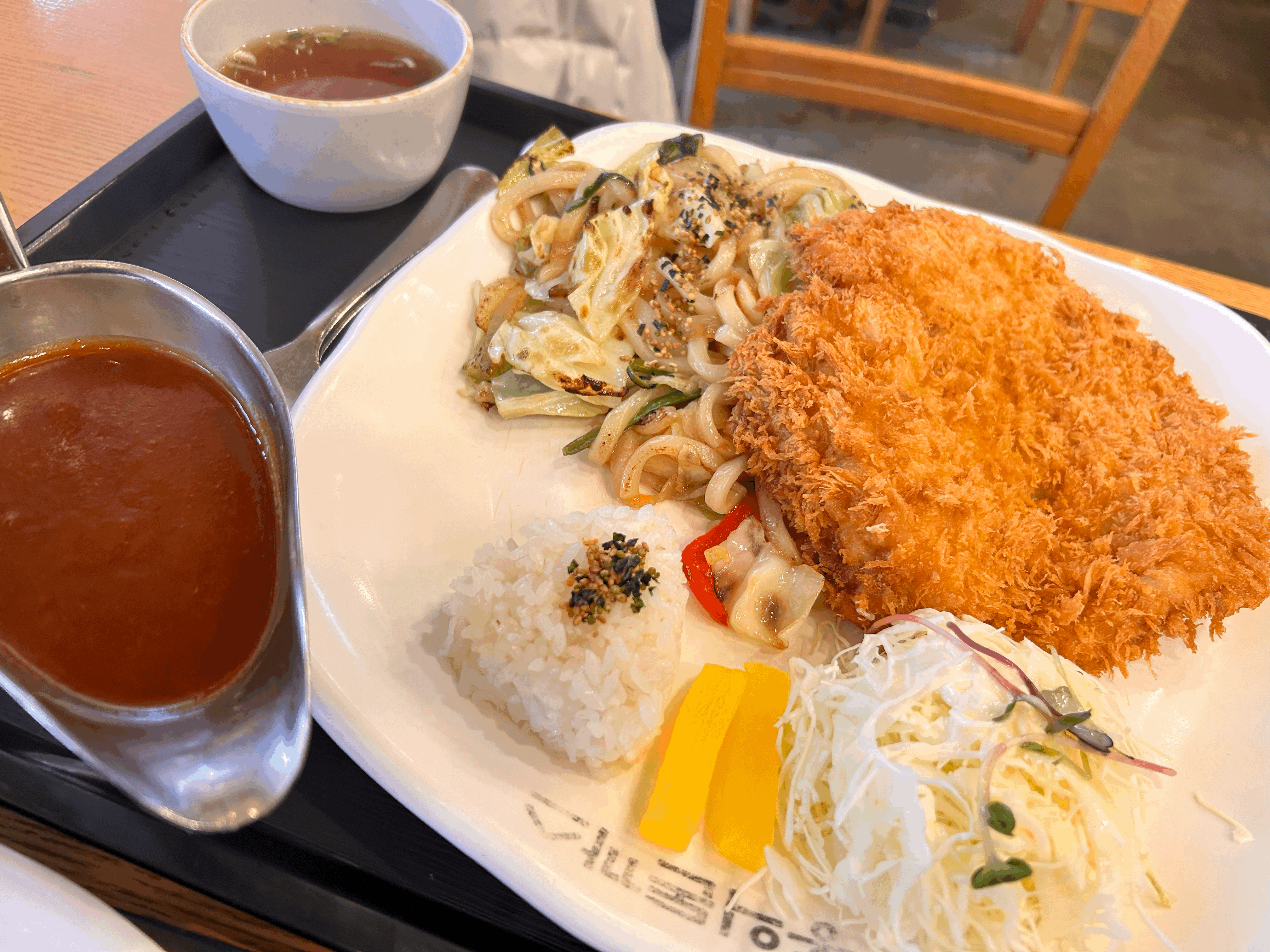 아이아빠가 시킨 메뉴는 볶음우동과 함께 돈까스를 즐길 수 있는 메뉴인 세트A에요. 그런데, 여기서 실수한 부분은 시킬때 볶음우동을 매운맛으로 시키려고 한것이 돈까스 소스를 매운맛으로 시킨거였어요. +1000원에 매운맛 추가가 있어서 당연히 볶음 우동인줄 알았으나, 돈까스 소스였다니 볶음우동이 왜이렇게 안맵지? 하고 소스를 먹었더니 맵더라구요. 주문을 실수해서 약간 당황스럽긴 했지만 그래도 매운맛 소스를 먹으니 새롭긴 했습니다. 다음엔 매운맛 볶음우동을 꼭 먹어봐야겠어요.