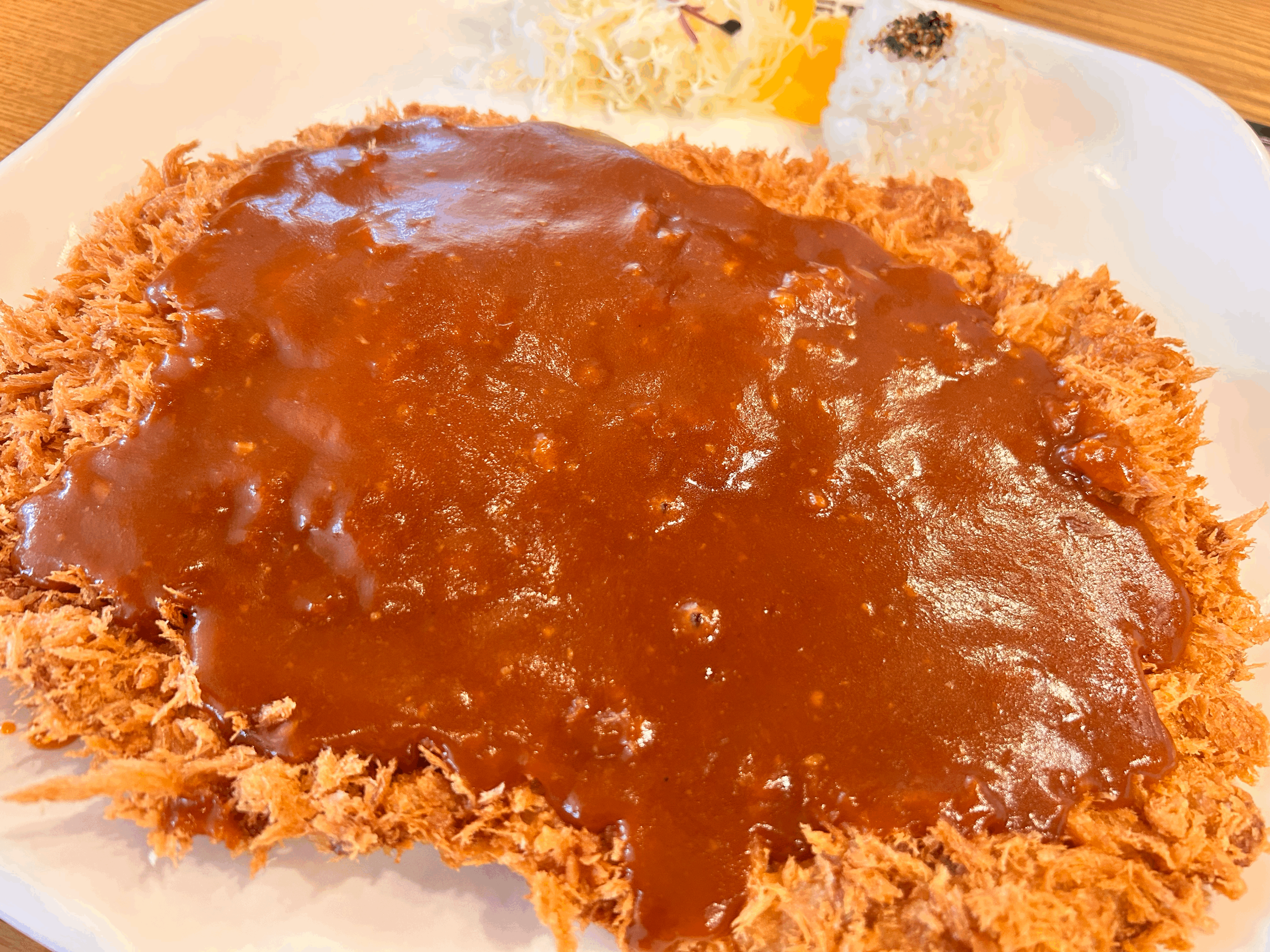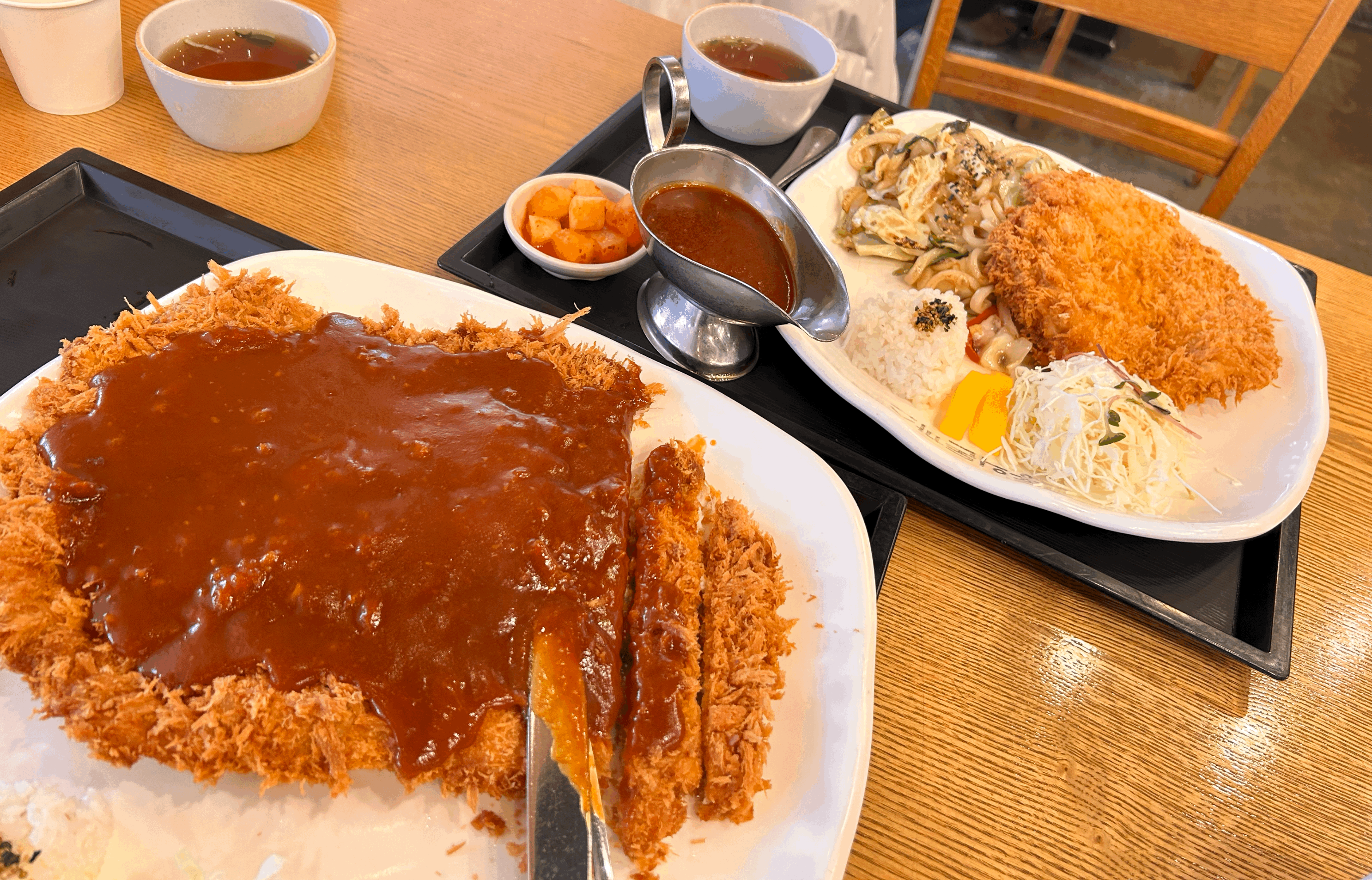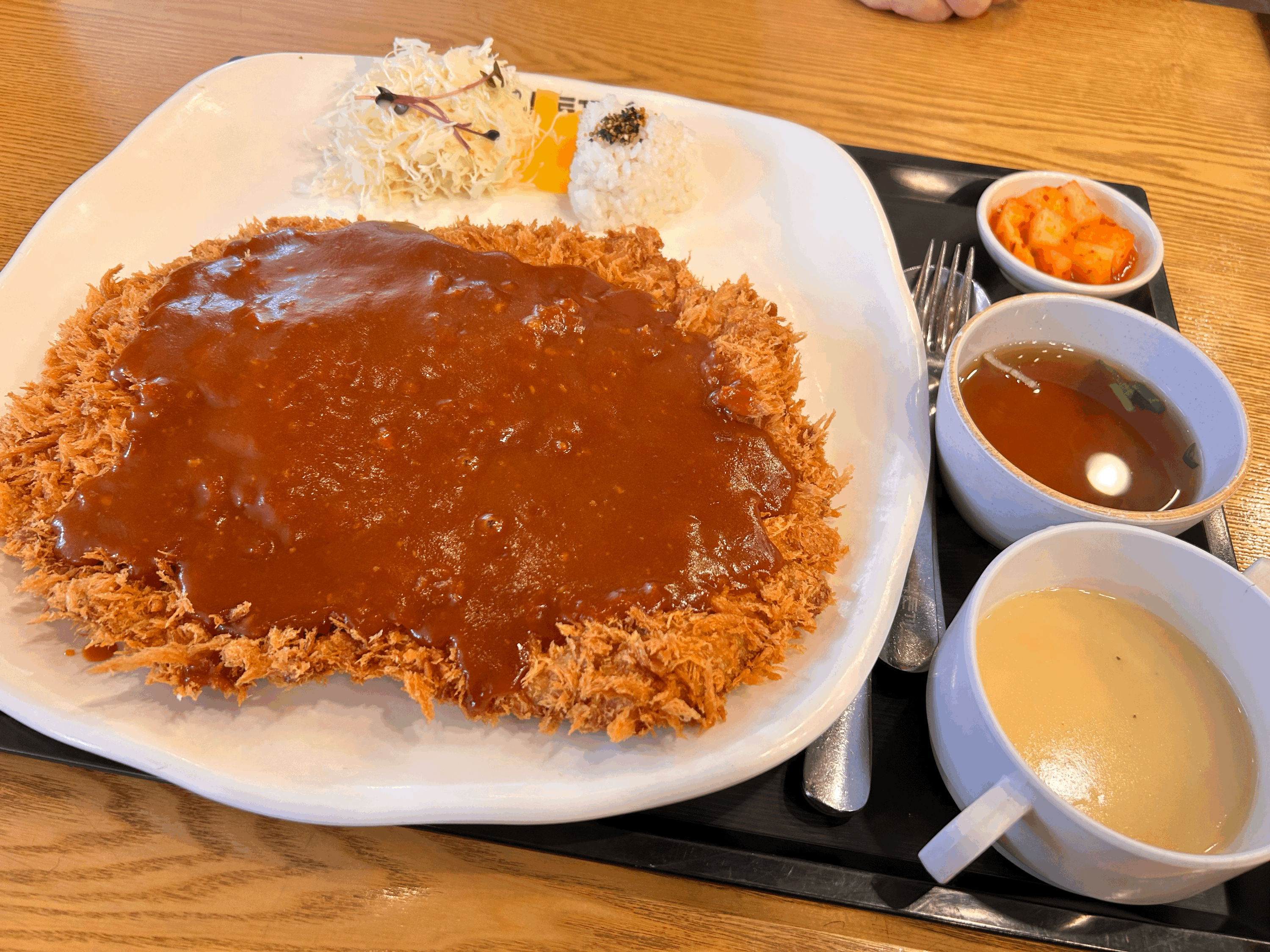 정말 말 그대로 엄청나게 큼지막한 왕돈까스 비주얼이에요. 거기다가 수프와 장국 그리고 깍두기가 함께 나왔어요.