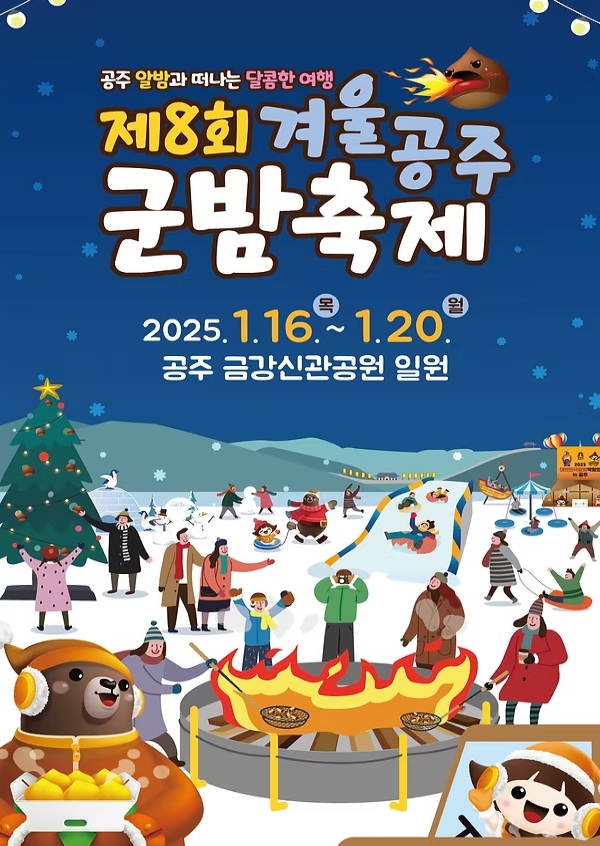 겨울 하면 생각나는 따뜻한 추억, 그중에서도 빠질 수 없는 게 바로 ‘군밤’이죠! 올겨울엔 가족, 친구, 연인과 함께 공주로 떠나보는 건 어떨까요? 중부권 대표 겨울 축제, 겨울공주 군밤축제가 1월 16일부터 20일까지 공주 금강신관공원에서 펼쳐집니다! 이번 축제의 주제는 공주 알밤과 떠나는 달콤한 여행이라고 합니다.
