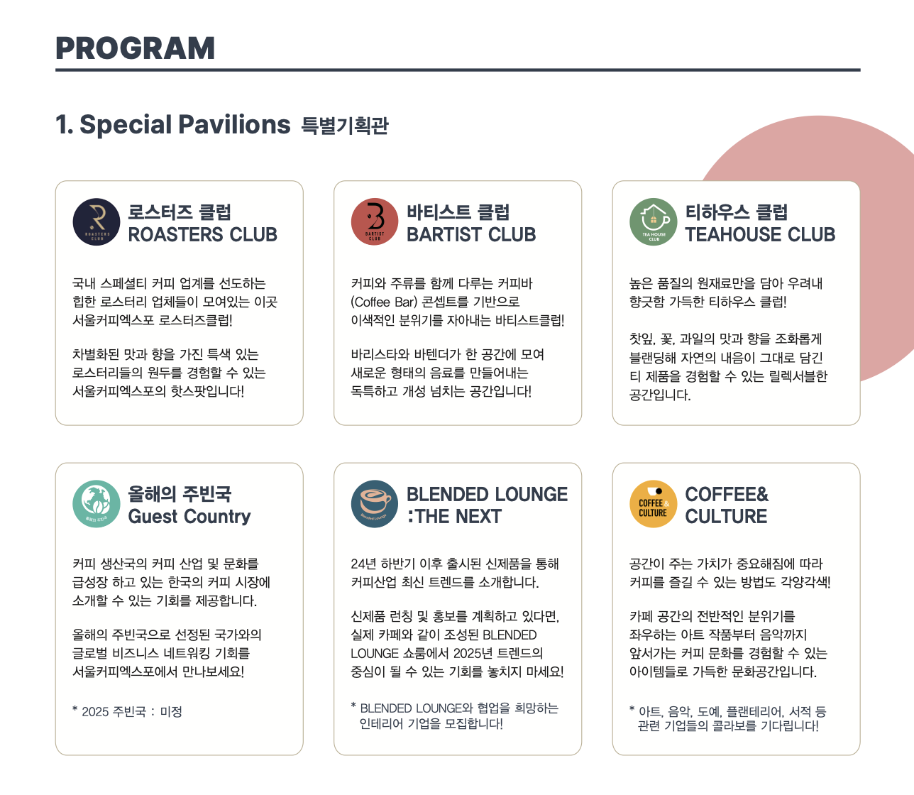 특히, 2025 서울커피박람회에서는 스페셜 파빌리온이라는 특별기획관을 즐기실 수 있습니다. 이곳에서는 로스터즈클럽, 바티스트클럽, 티하우스클럽, 올해의 주빈국, 블렌디드 라운지, 커피 엔 컬쳐 가 있는 공간입니다. 차별화된 각각의 공간들을 통해 특색 있는 로스터리들의 원두들을 경험하실 수 있습니다. 이곳에서 커피 트렌드를 확인하시고, 커피를 마음껏 즐기실 수 있습니다.